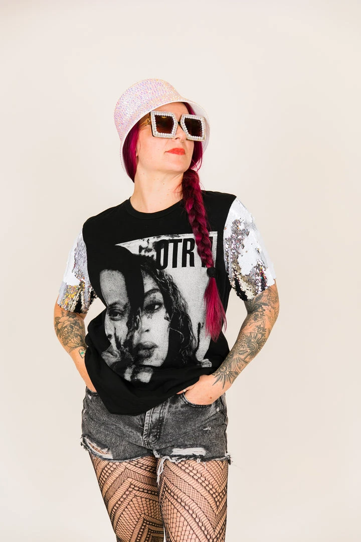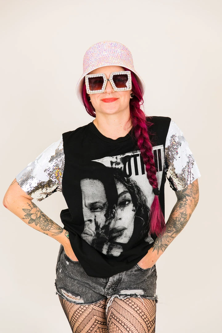 Our one of a kind party tee  – Beyonce and Jay-Z OTR white and silver sequin sleeve party tee. T-shirt is made of cotton.Â