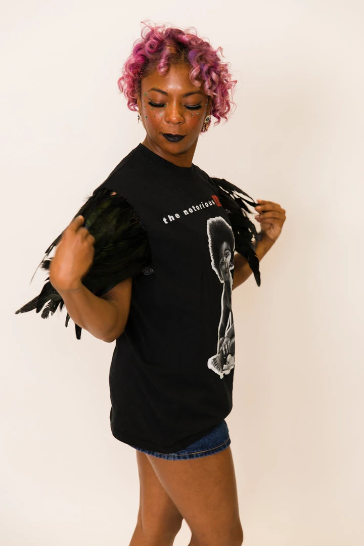 Our one of a kind party tee  -Biggie feather sleeve party tee. T-shirt is made of cotton.Â