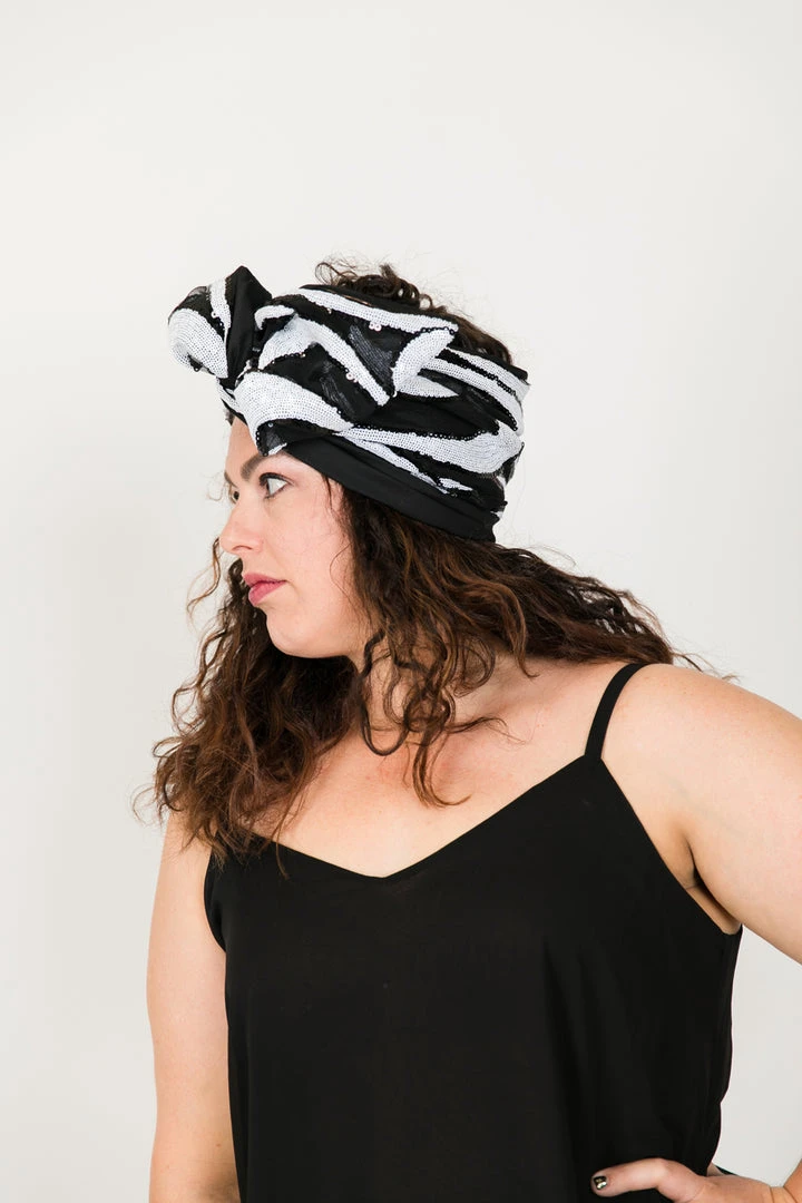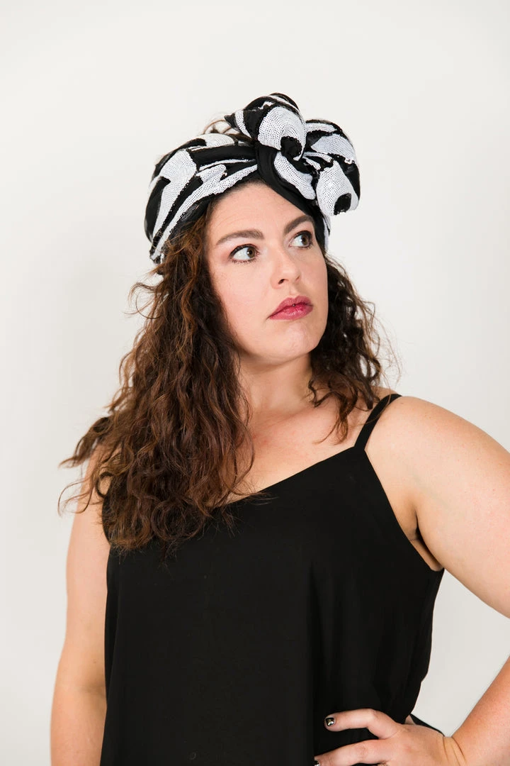 Our classic wrap  – made in black and white abstract sequin and cotton backed fabric. Reversible for multiple uses!