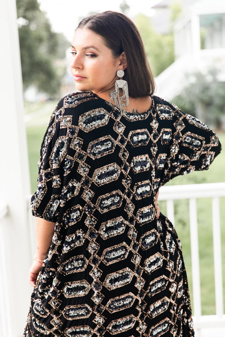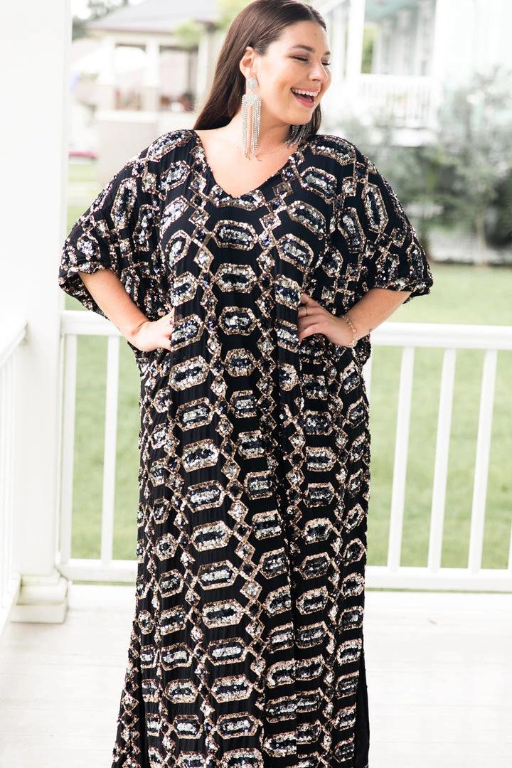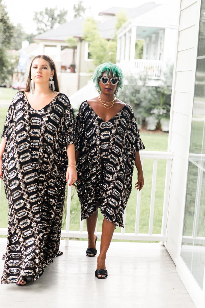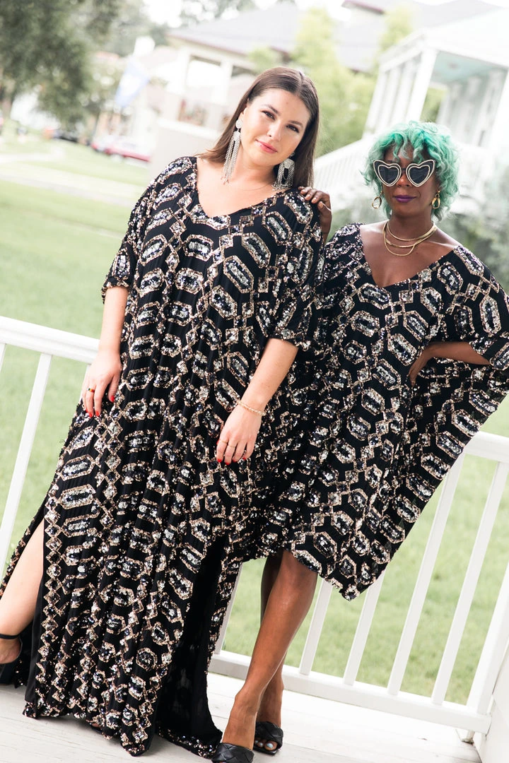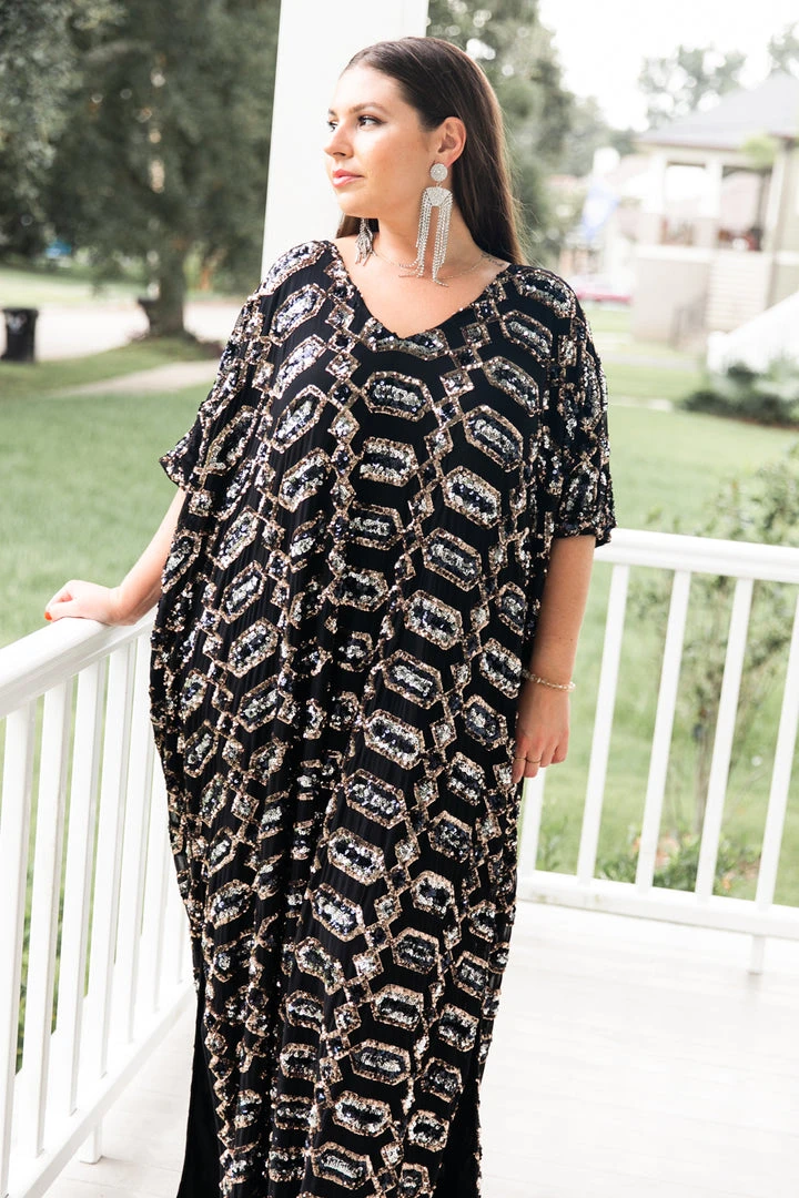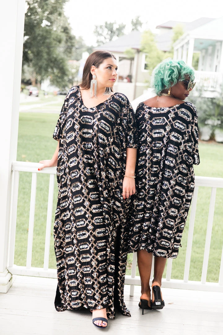 Black, bronze, and silver embroidered long caftan. Lined with poly black stretch fabric