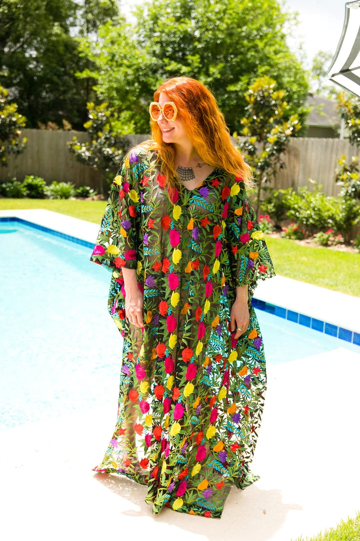 Black floral embroidered long caftan.Â