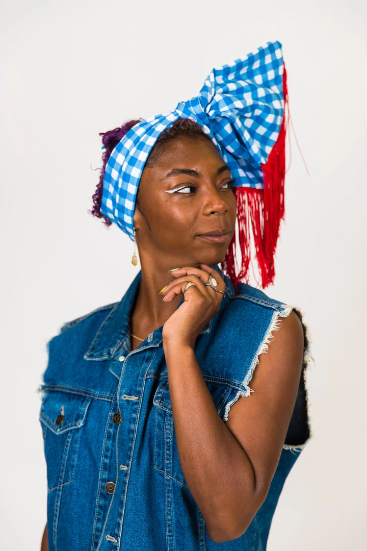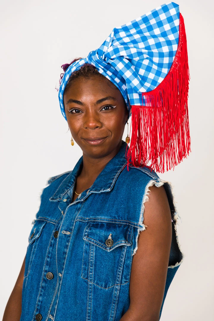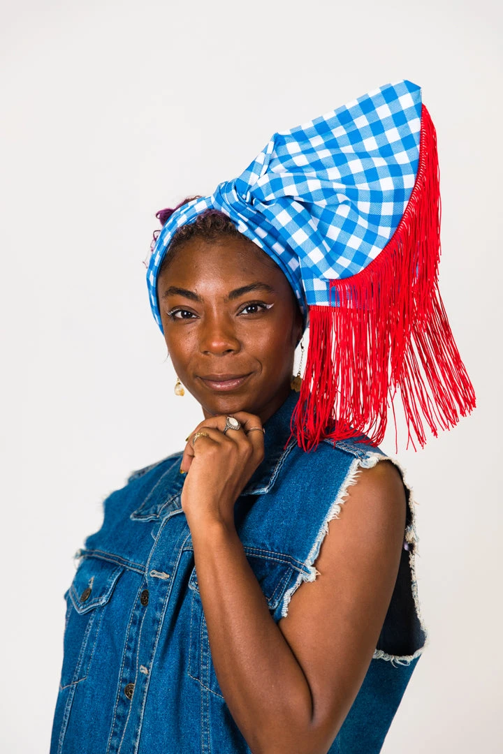 Our classic wrap  – made in blue and white cotton fabric with red fringe trim.