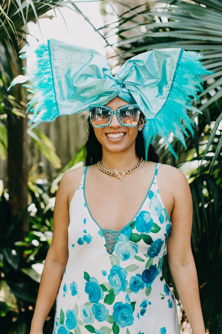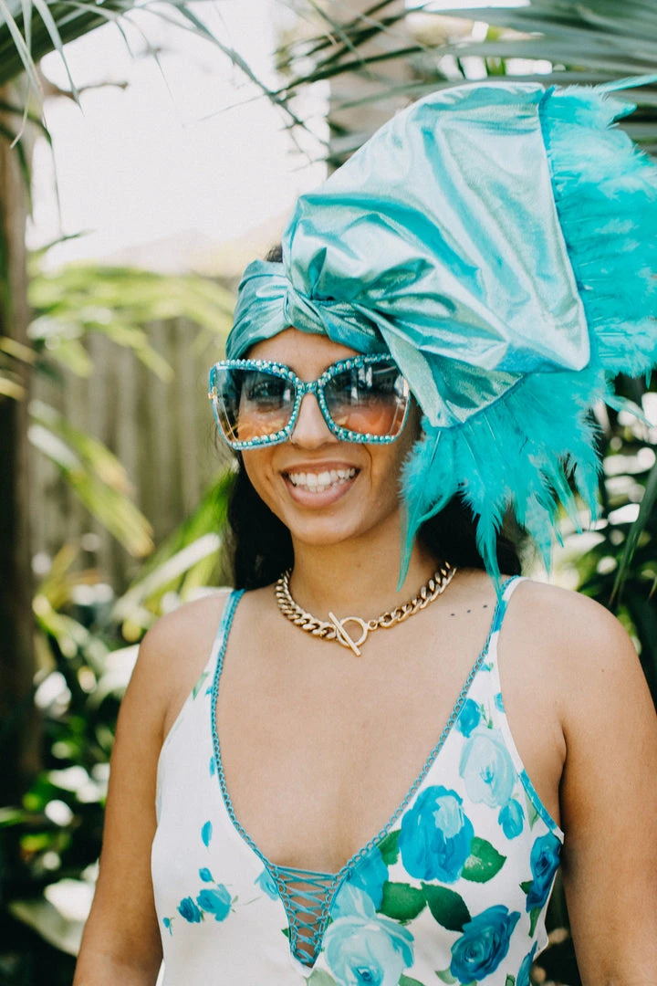 Our classic wrap – made in blue metallic with blue feather trim