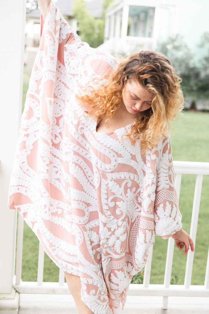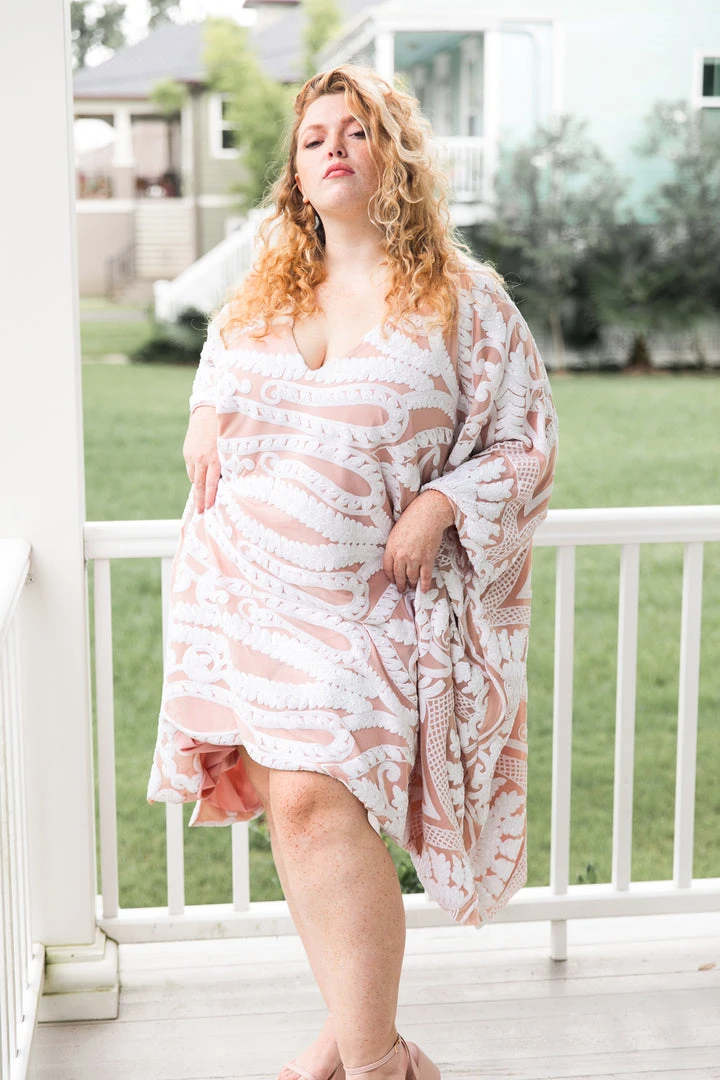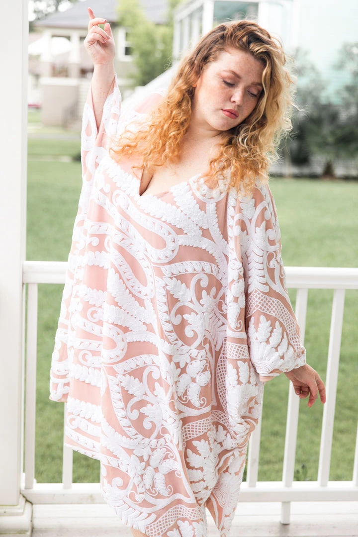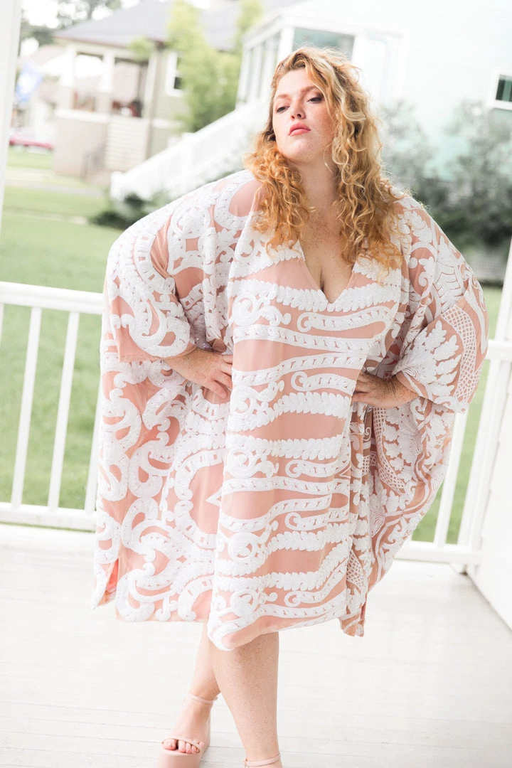 White sequin appliqué embroidered short caftan. Lined with poly nude stretch fabric