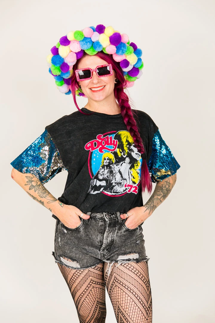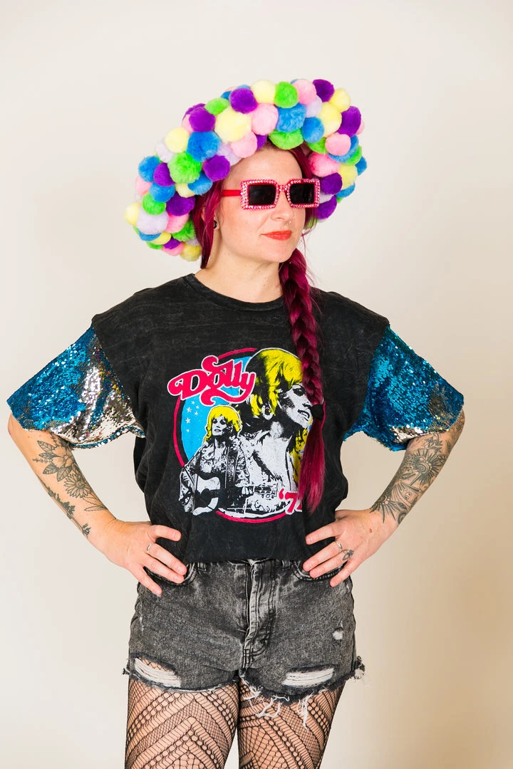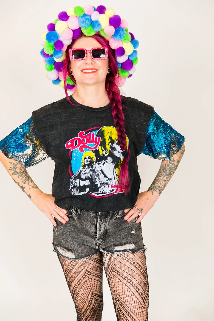 Our one of a kind party tee – Dolly Parton blue and silver sequin sleeve party tee. T-shirt is made of cotton.