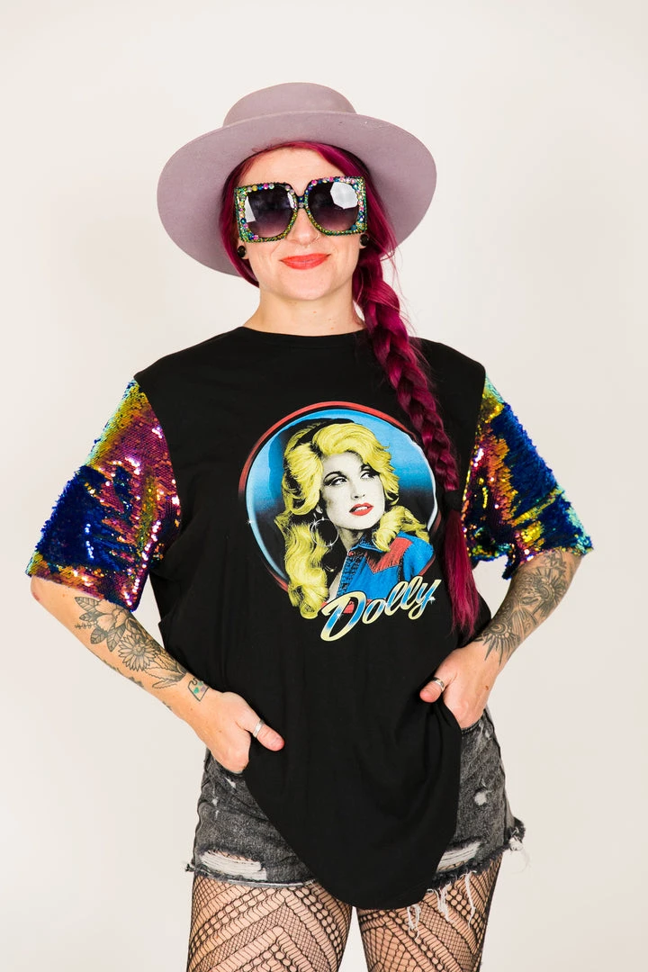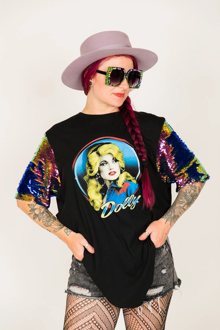 Our one of a kind party tee  – Dolly Parton blue holographic sequin sleeve party tee. T-shirt is made of cotton.Â