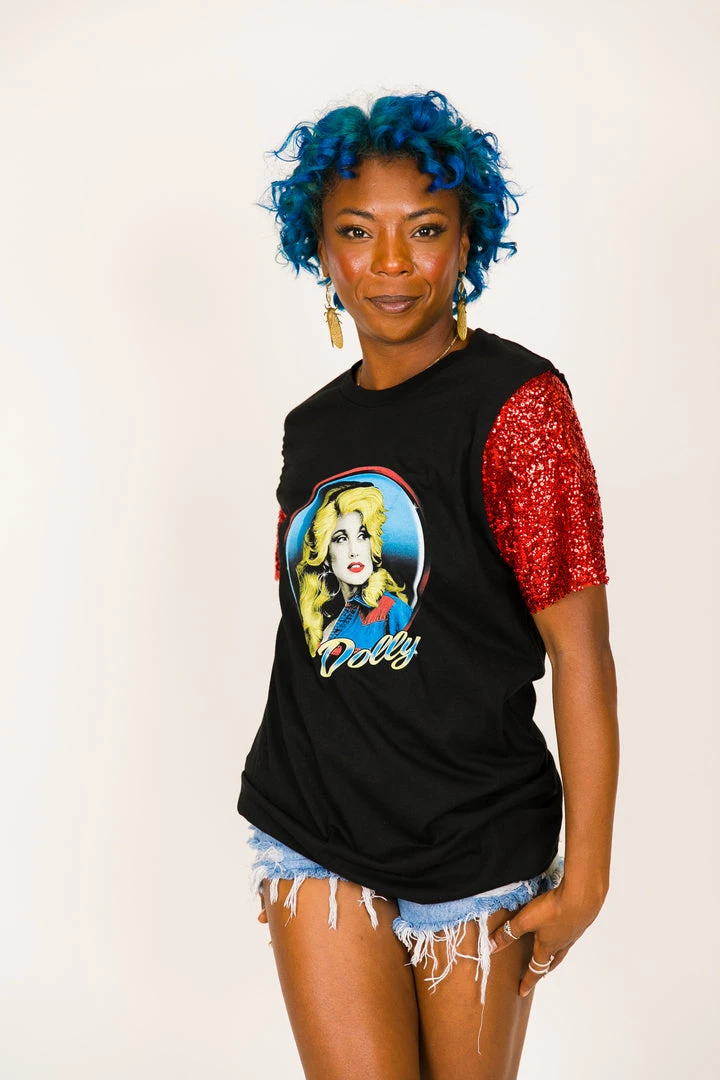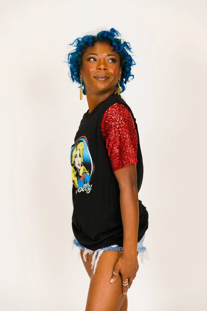 Our one of a kind party tee  – Dolly Parton red sequin sleeve party tee. T-shirt is made of cotton.Â