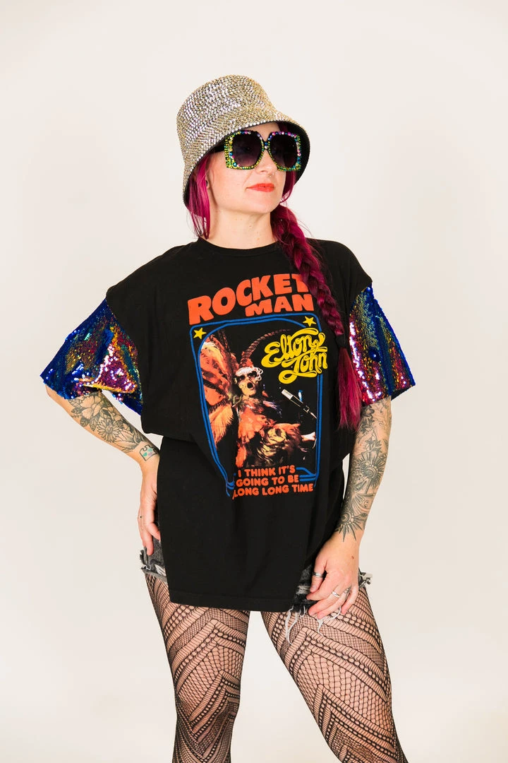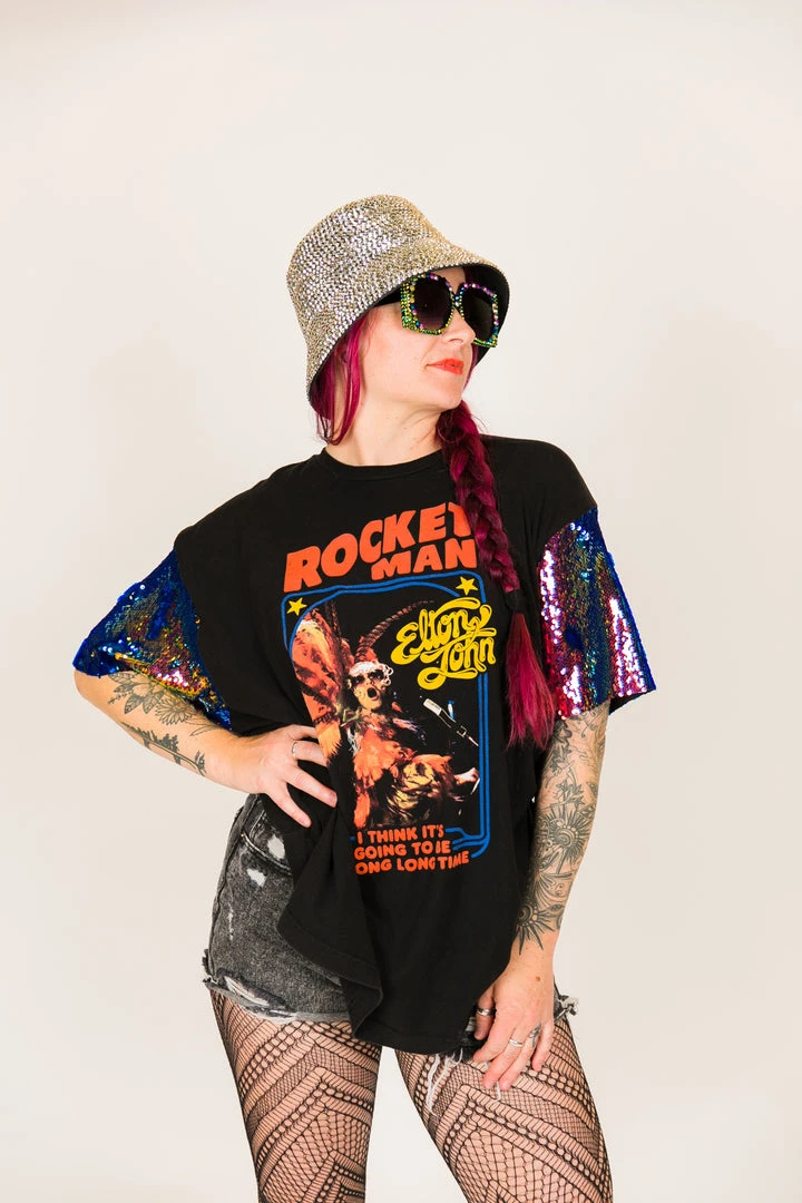 Our one of a kind party tee – Elton John blue holographic sequin sleeve party tee. T-shirt is made of cotton.