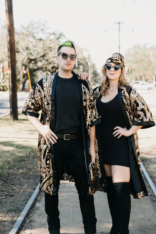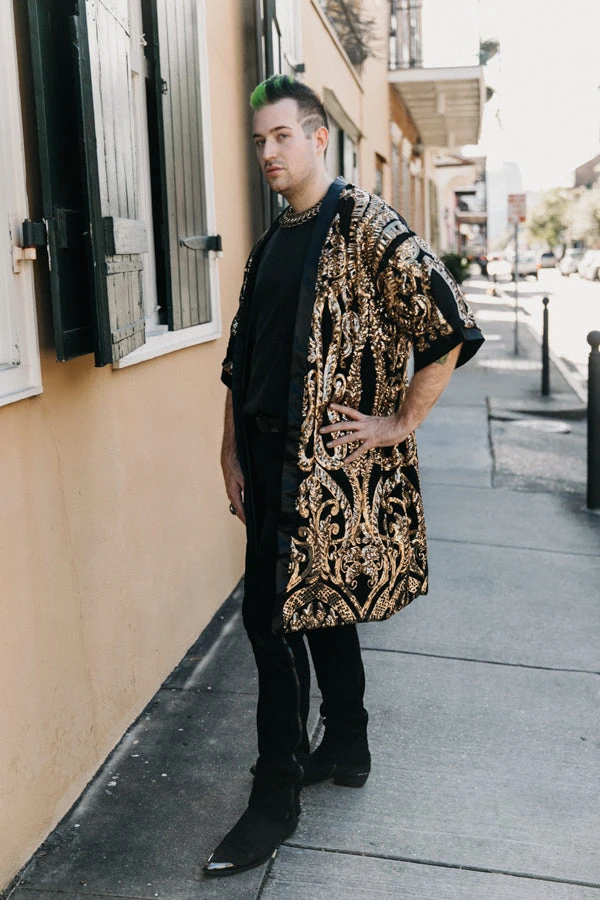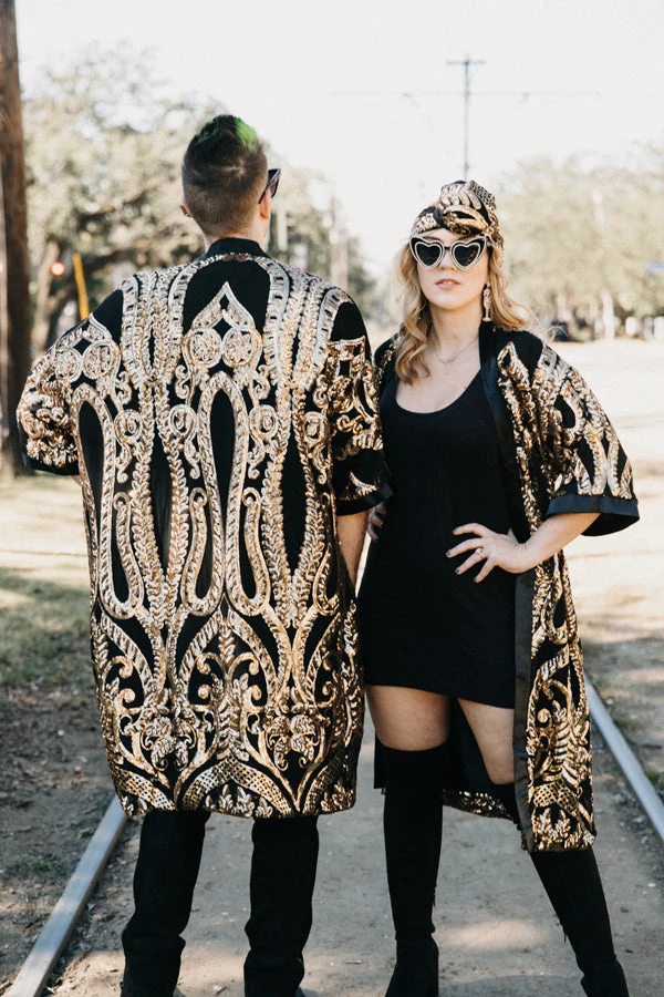 Sequin Duster Jacket with gold embroidered sequins and black satin.