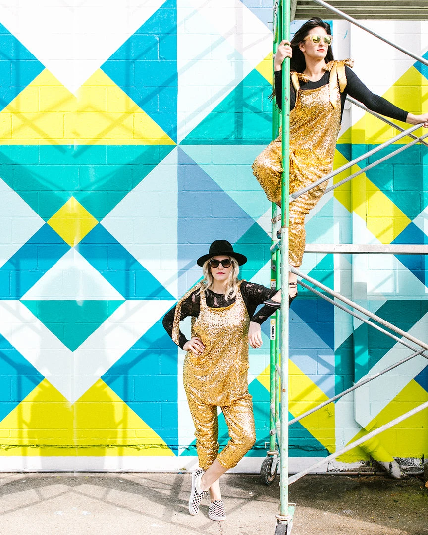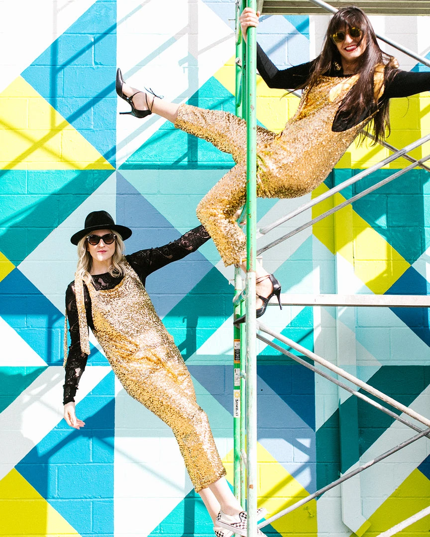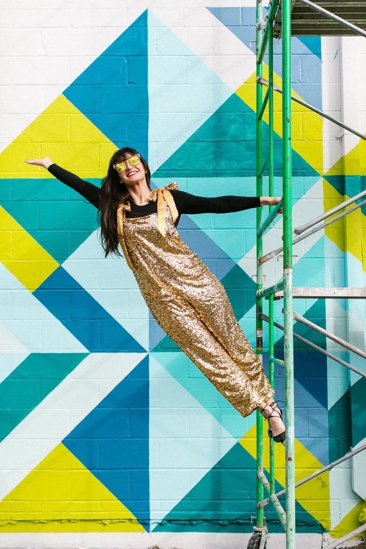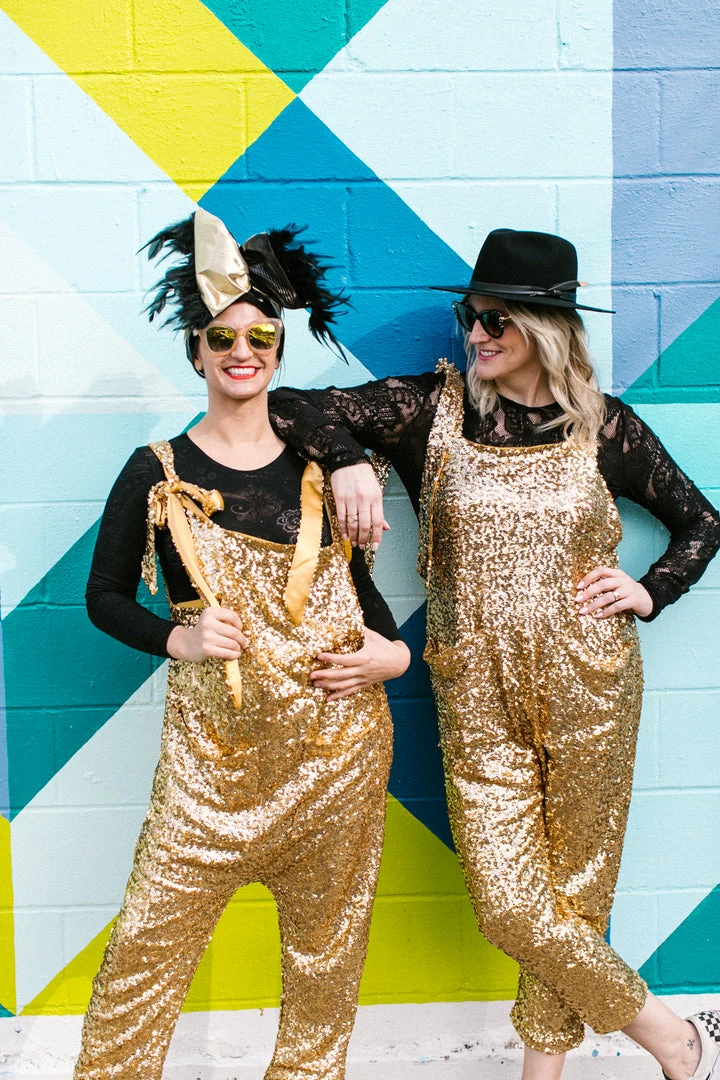 Our party jumpsuit  – gold adjustable tie sequin jumpsuit with pockets.Â