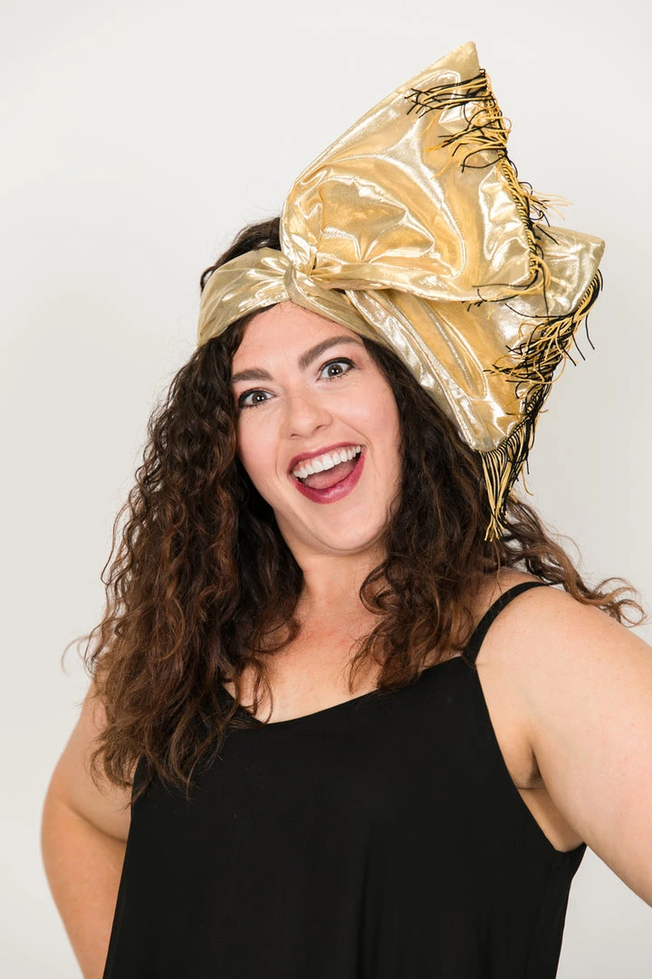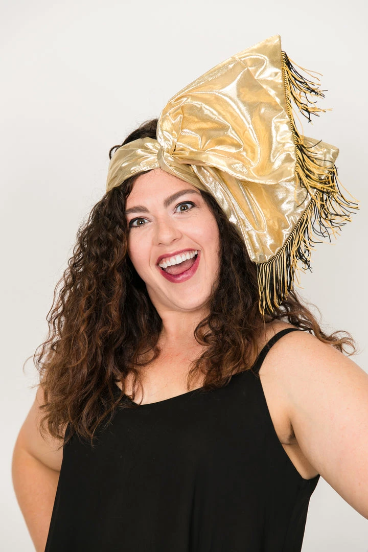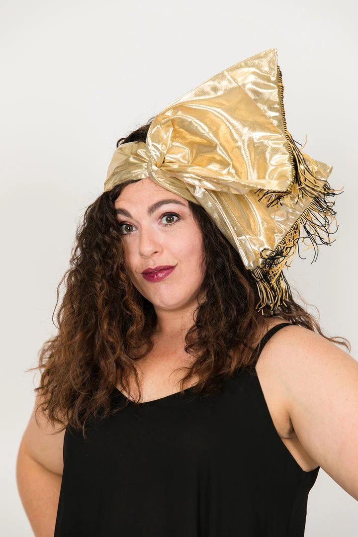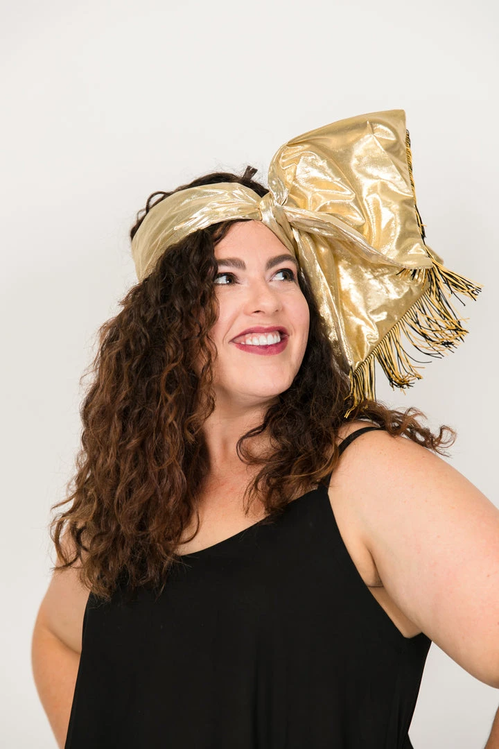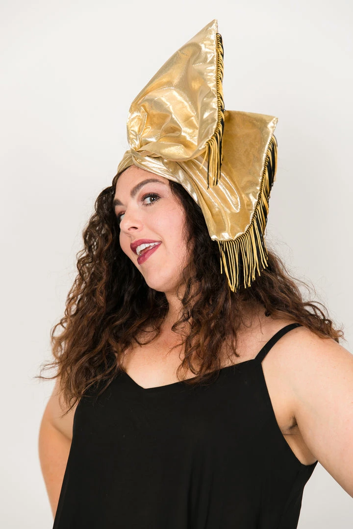 Our classic wrap  – made in gold with black and gold fringe trim.