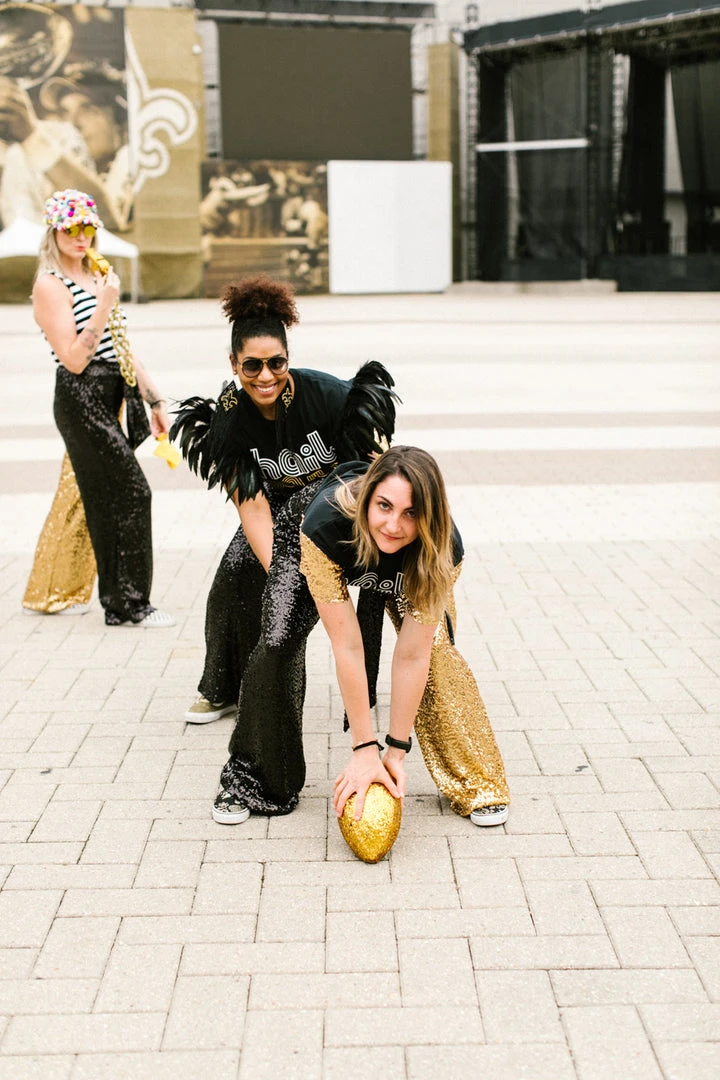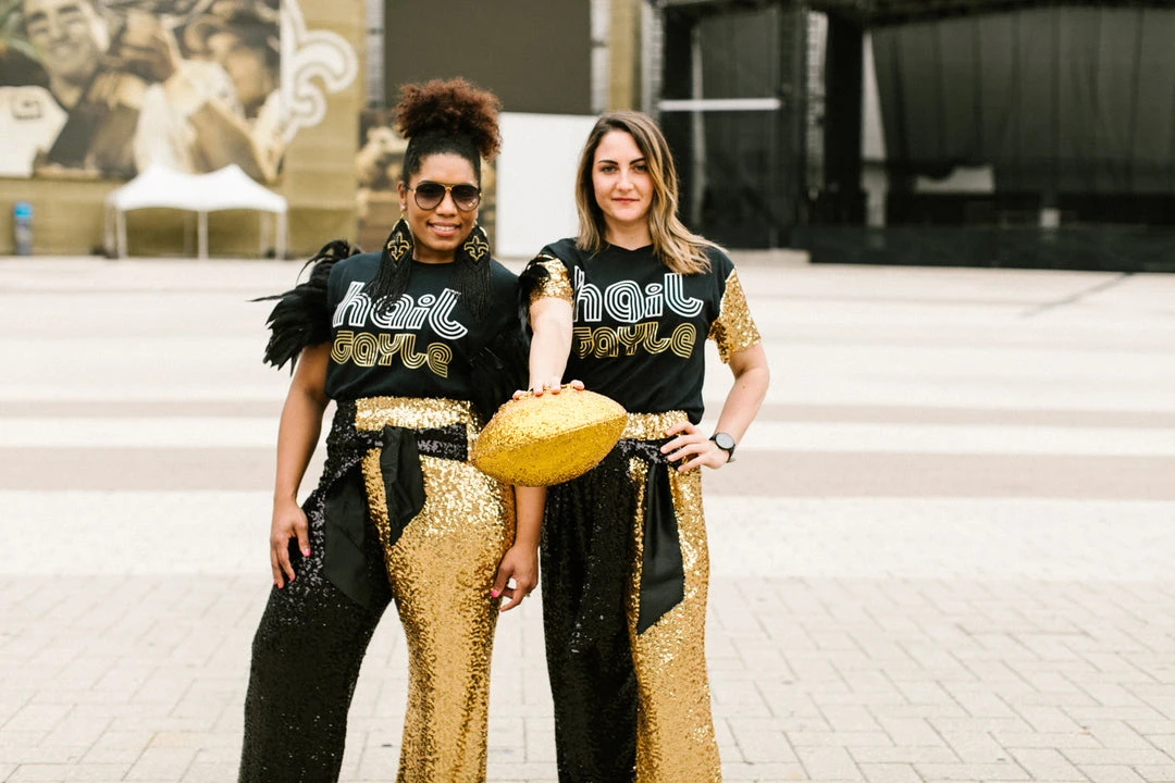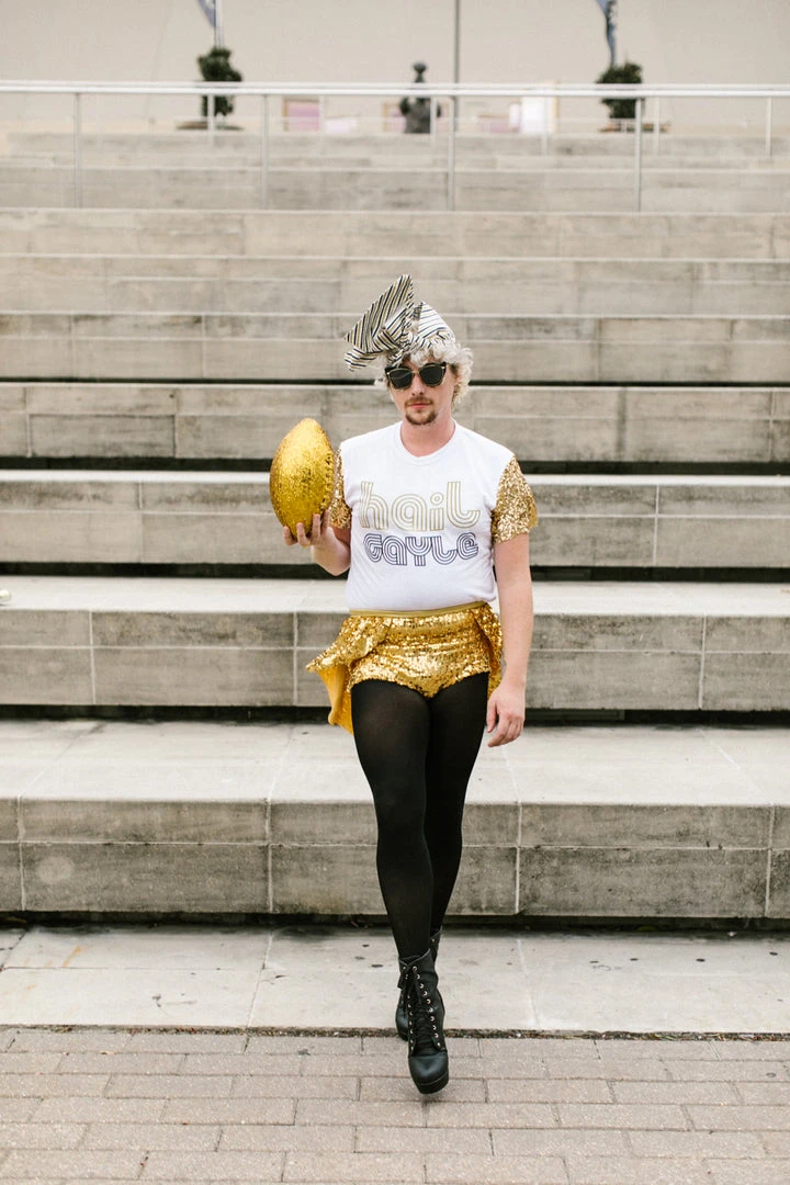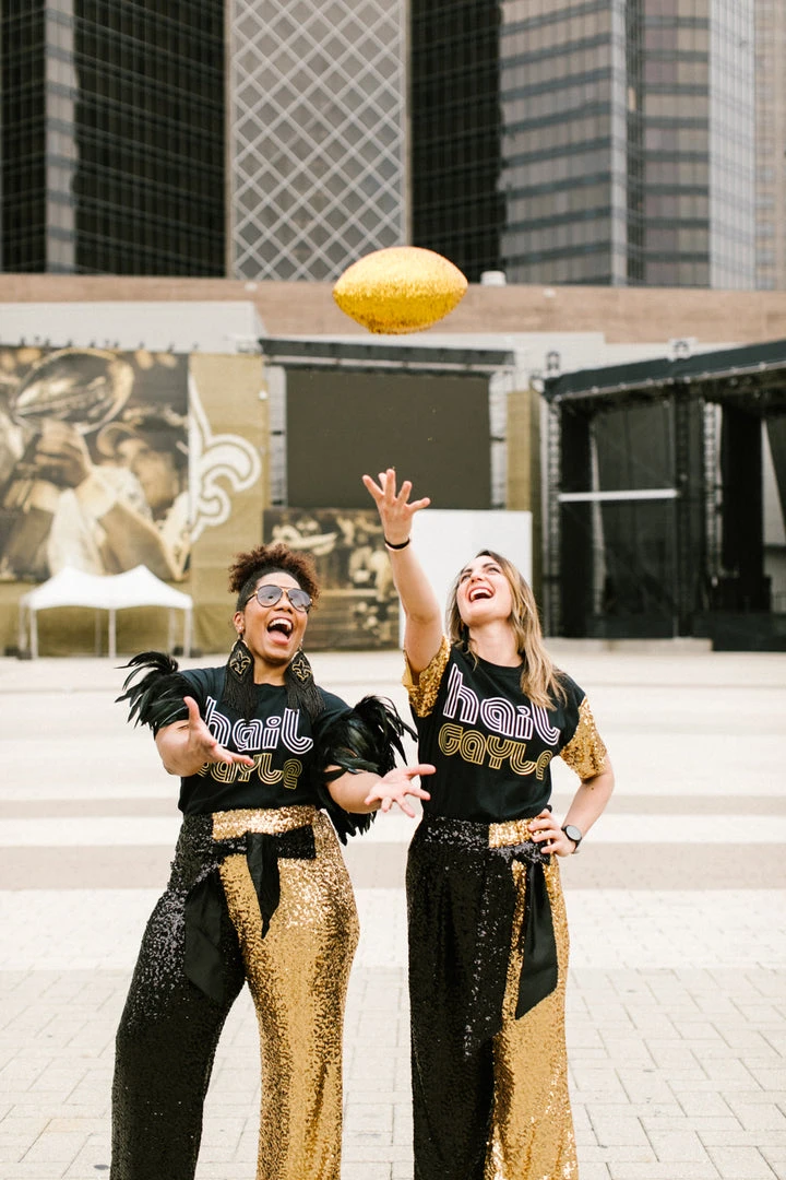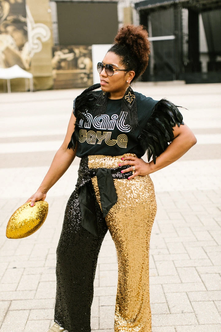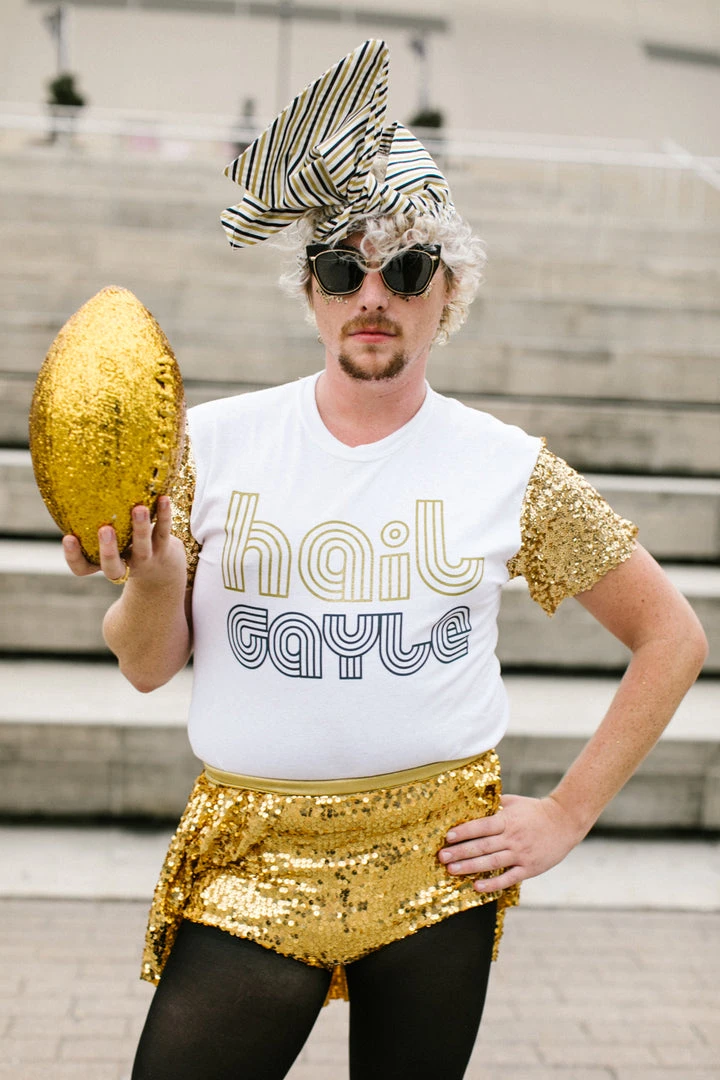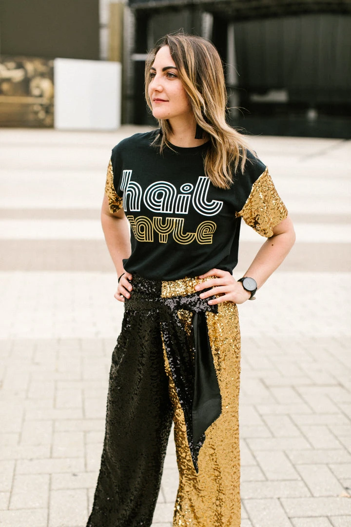 Our Saints party tee  – Hail Gayle sequin and feather sleeve tee. Available in 3 options. Black with gold sequin sleeves. Black with feather sleeves. White with gold sequin sleeves.