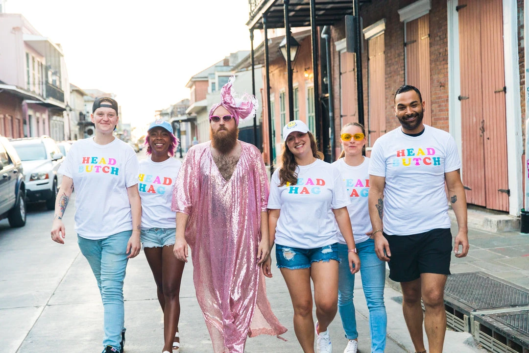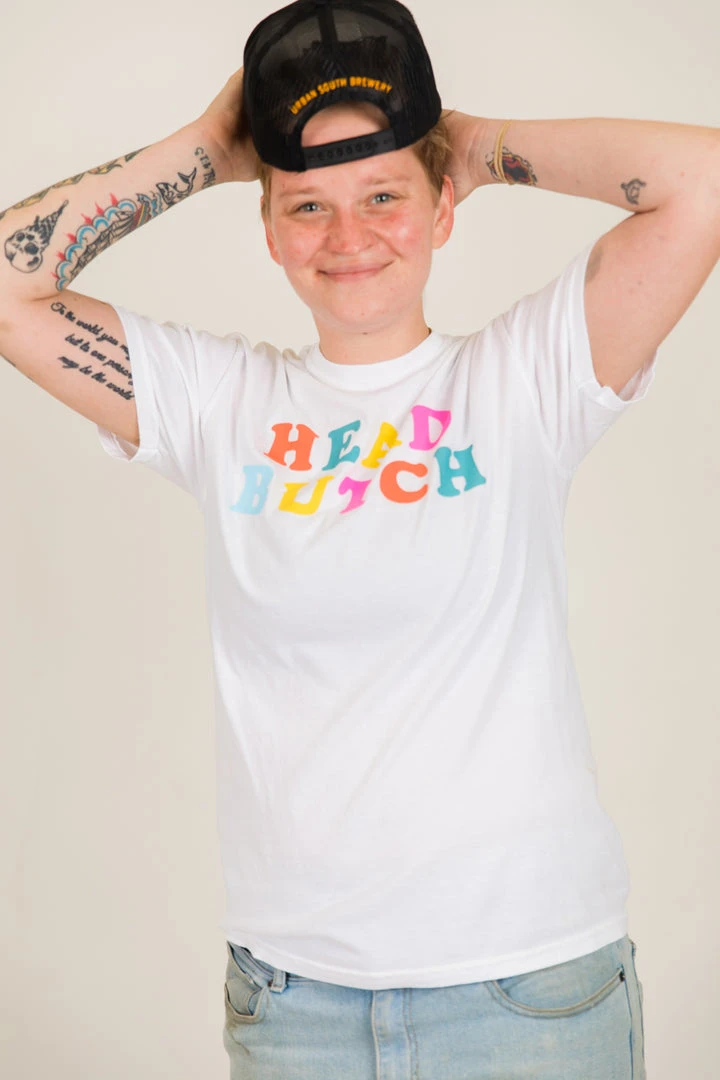 “Head Butch” screen-printed white shirt. Let the people know who the Head Butch really is with this fun and colorful shirt.