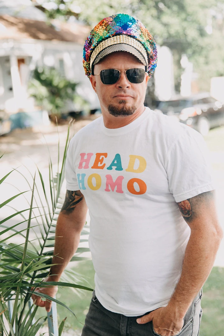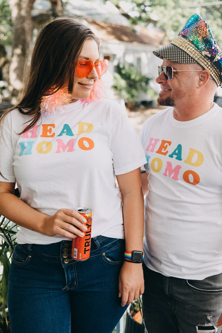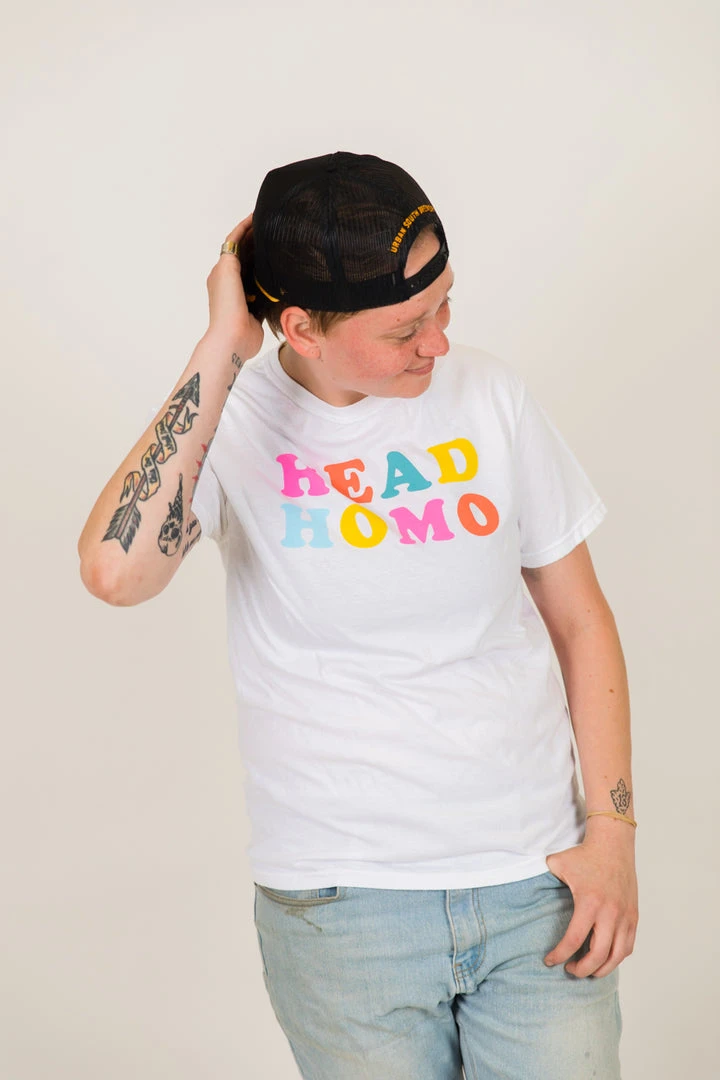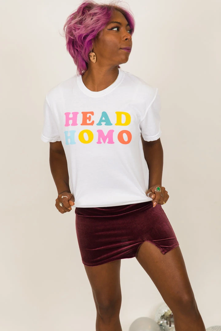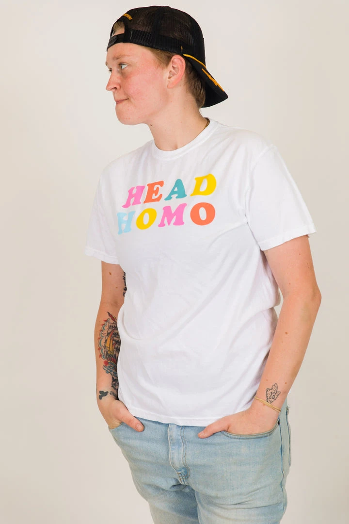 “Head Homo” screen-printed white shirt. Let the people know who the Head Homo in town is really is with this fun and colorful shirt.