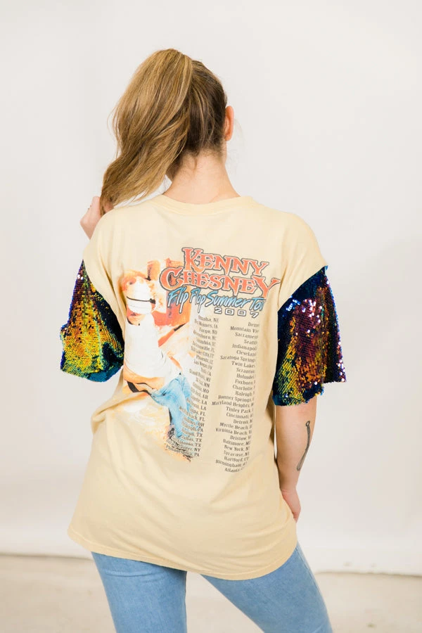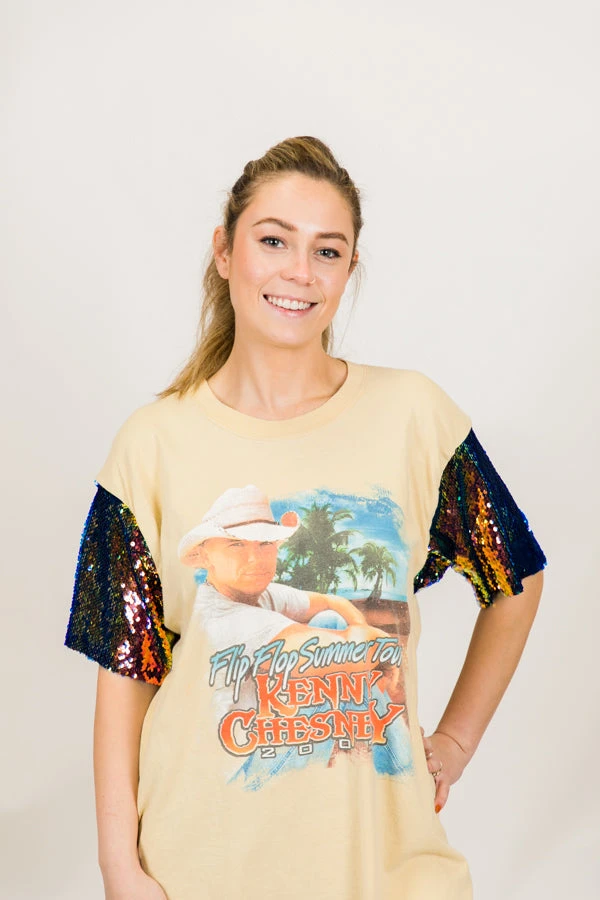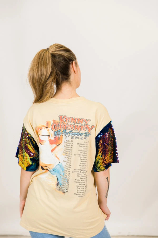 Our party tee – Kenny Chesney blue iridescent sequin party tee. T-shirt is made of cotton.