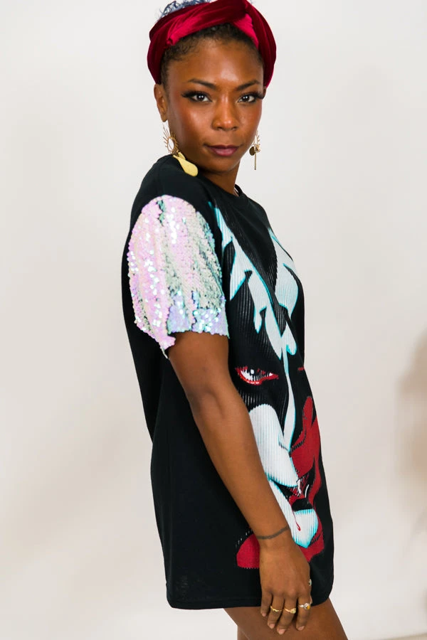 Fringe Co Whitney Houston Pink And Blue Sequin Sleeve Party Tee
