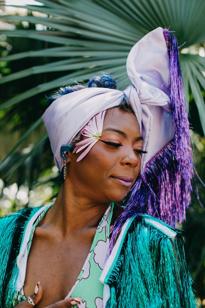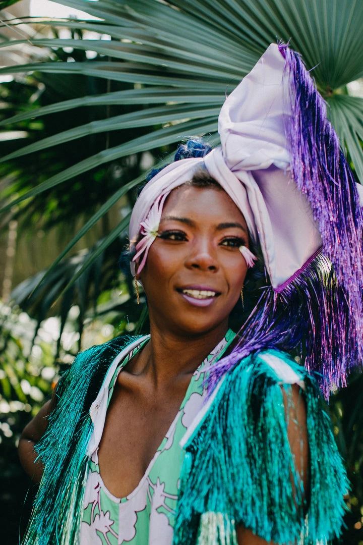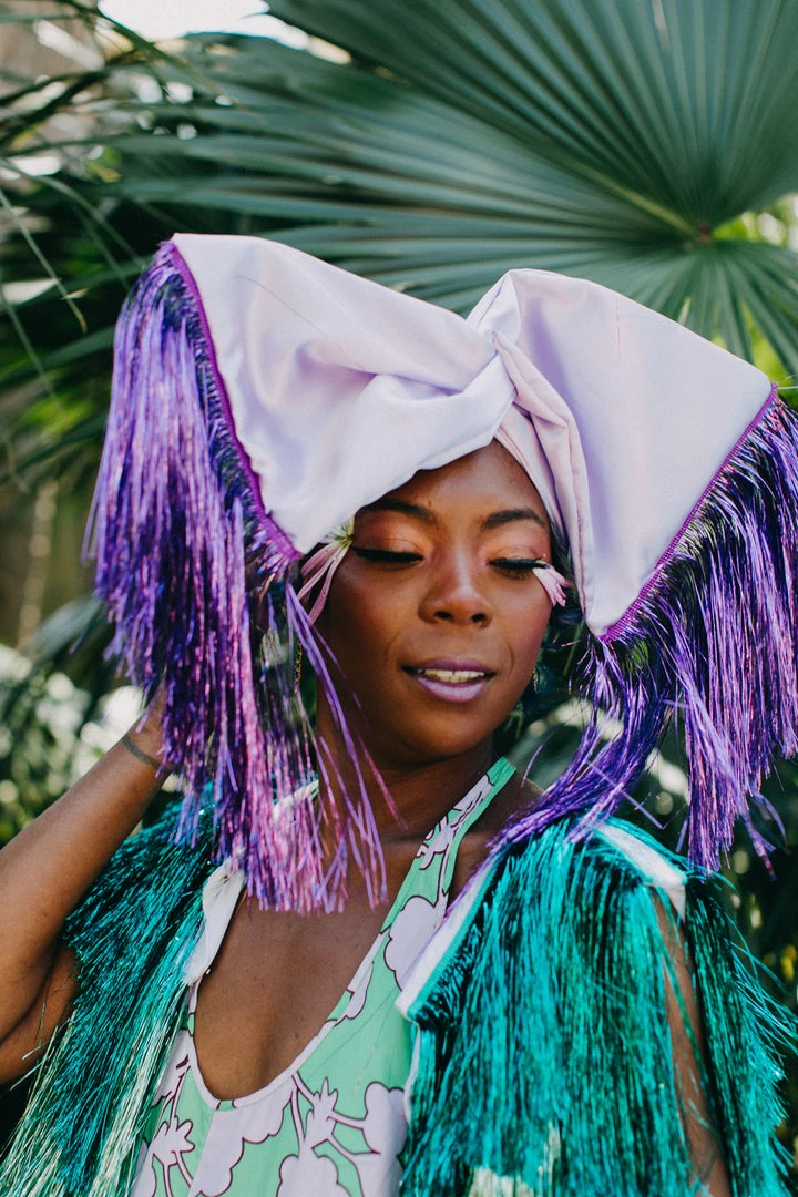 Our classic wrap  – made in purple satin with purple tinsel fringe trim