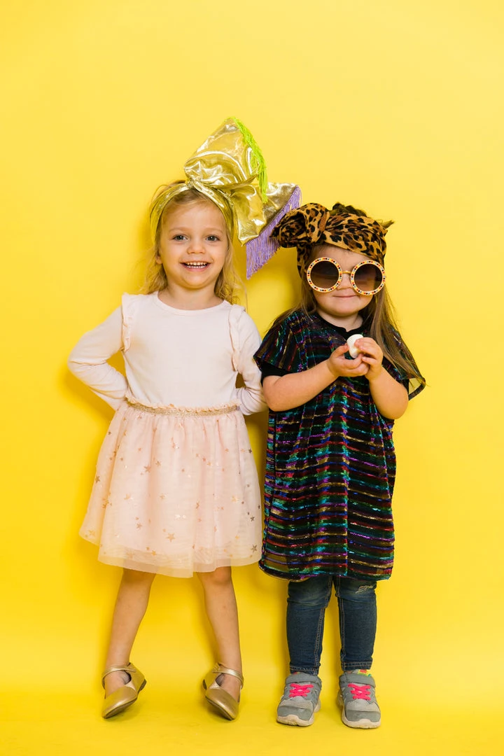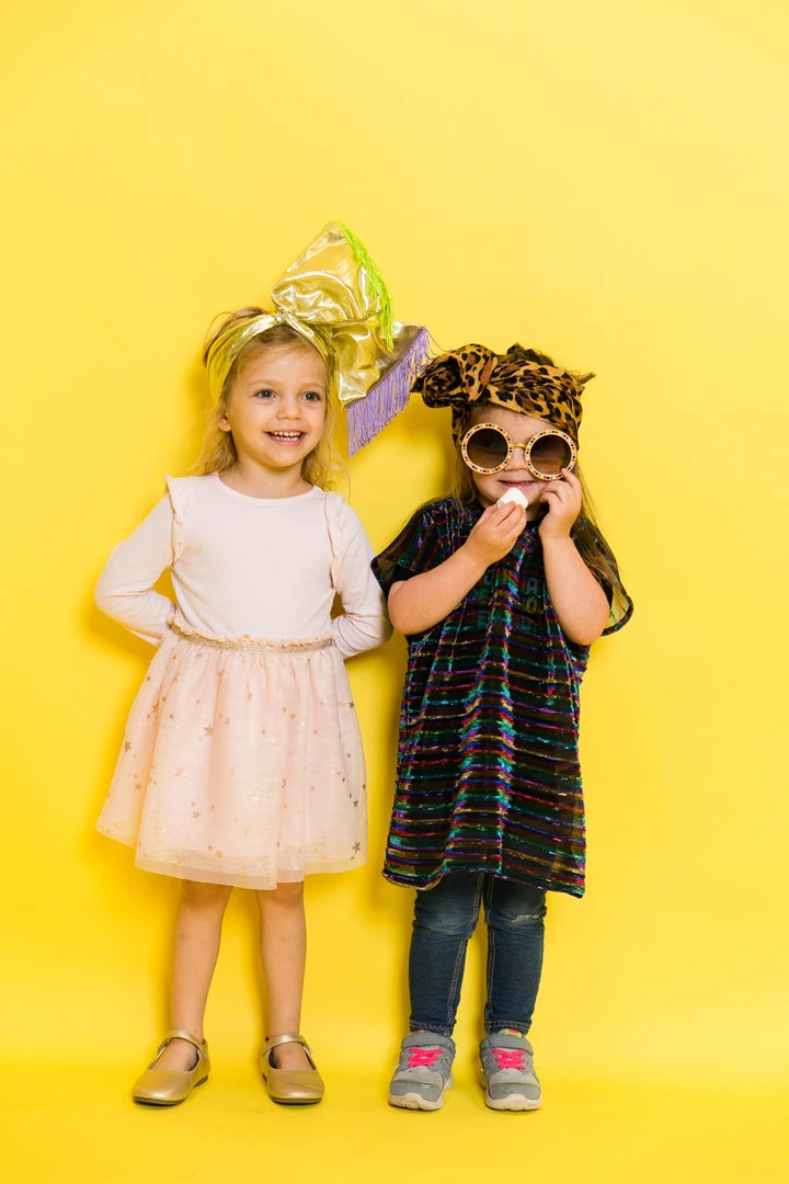 Our mini wrap  – made in metallic gold with purple and green fringe trim. Adjustable wire for versatility of use and design. Please note adults can wear these, they will be smaller than our regular wraps but still fit adults.