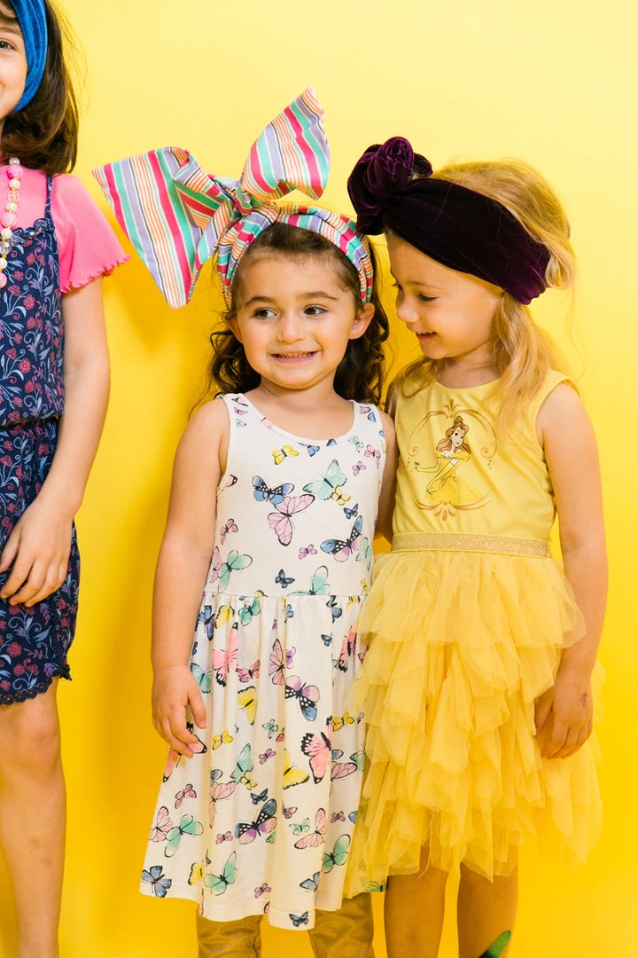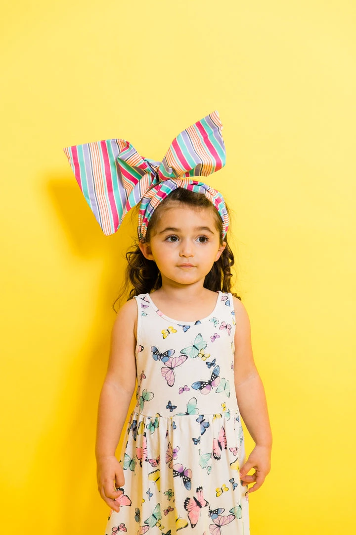 Our mini wrap  – made in purple and pink stripe cotton. Adjustable wire for versatility of use and design. Please note adults can wear these, they will be smaller than our regular wraps but still fit adults.