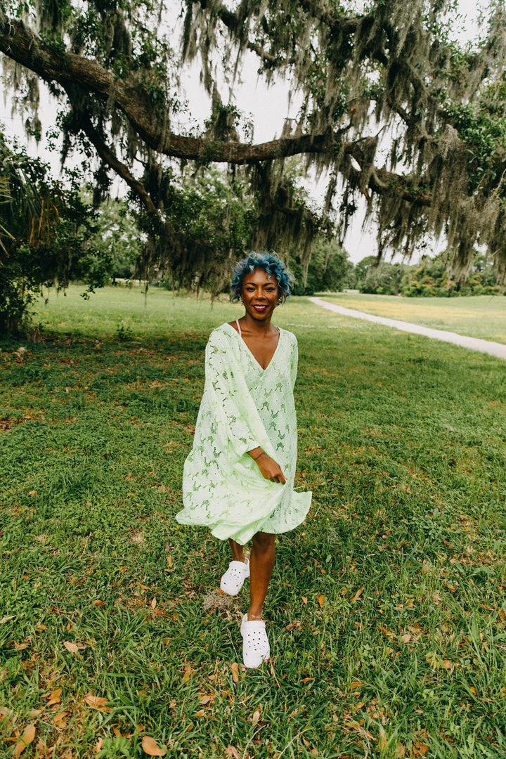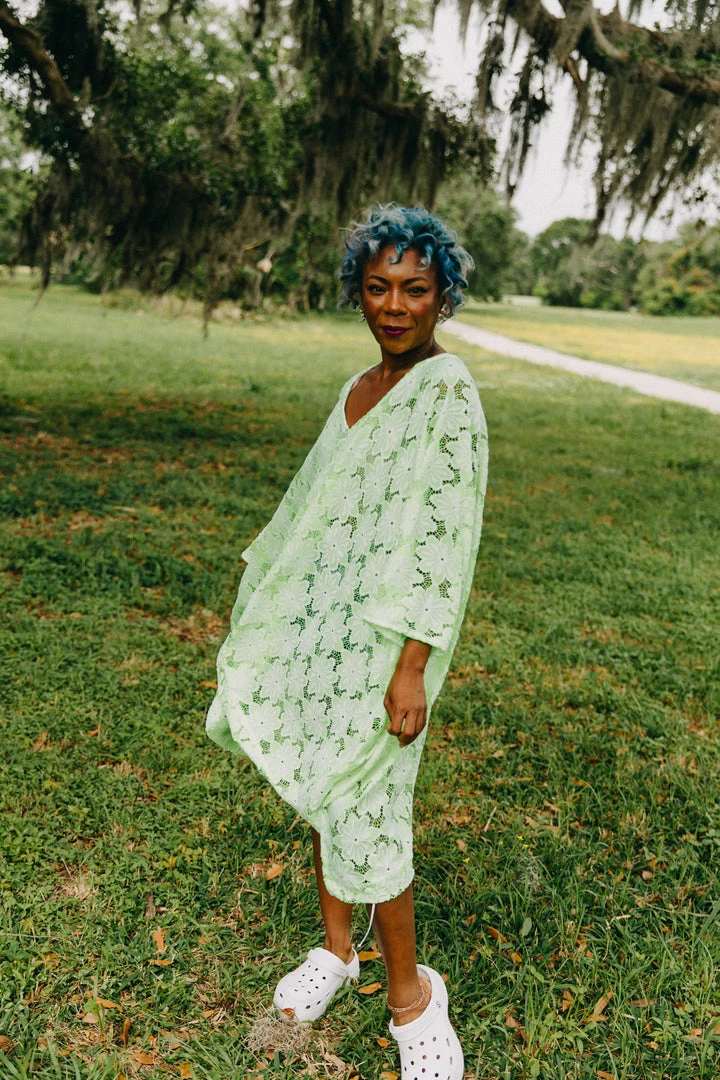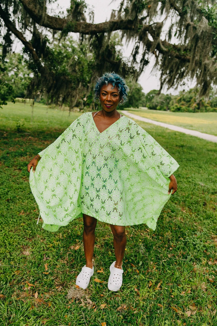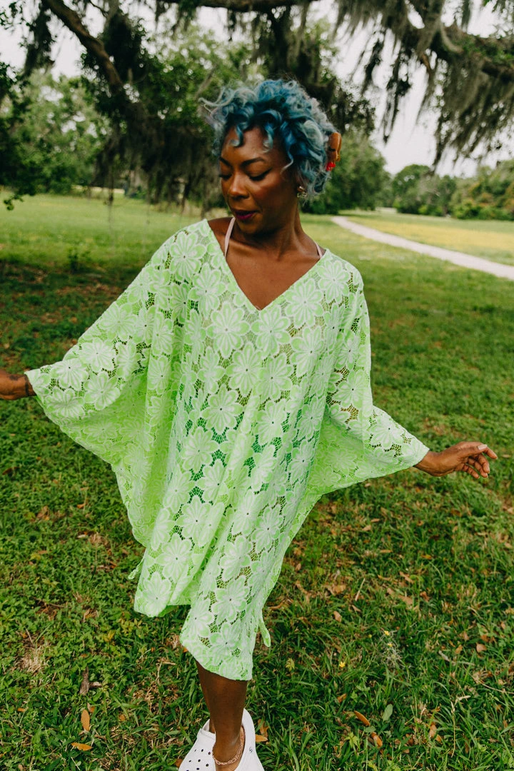 Neon green floral embroidered short caftan.