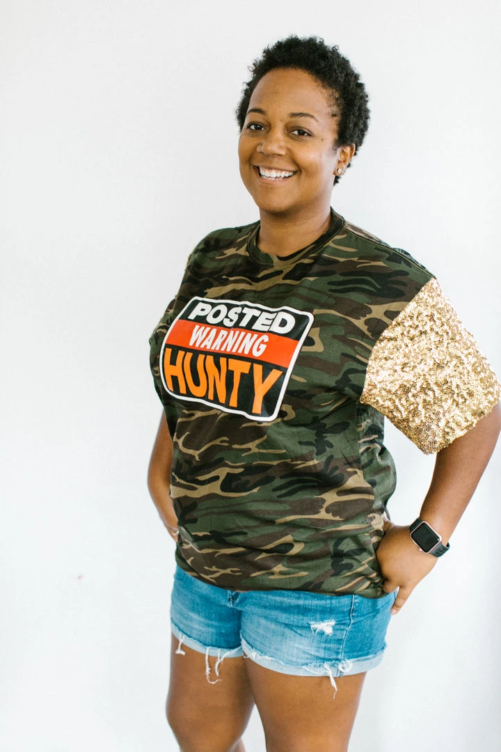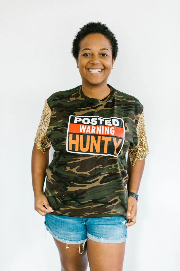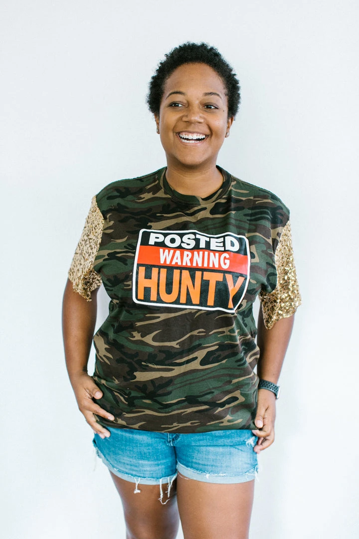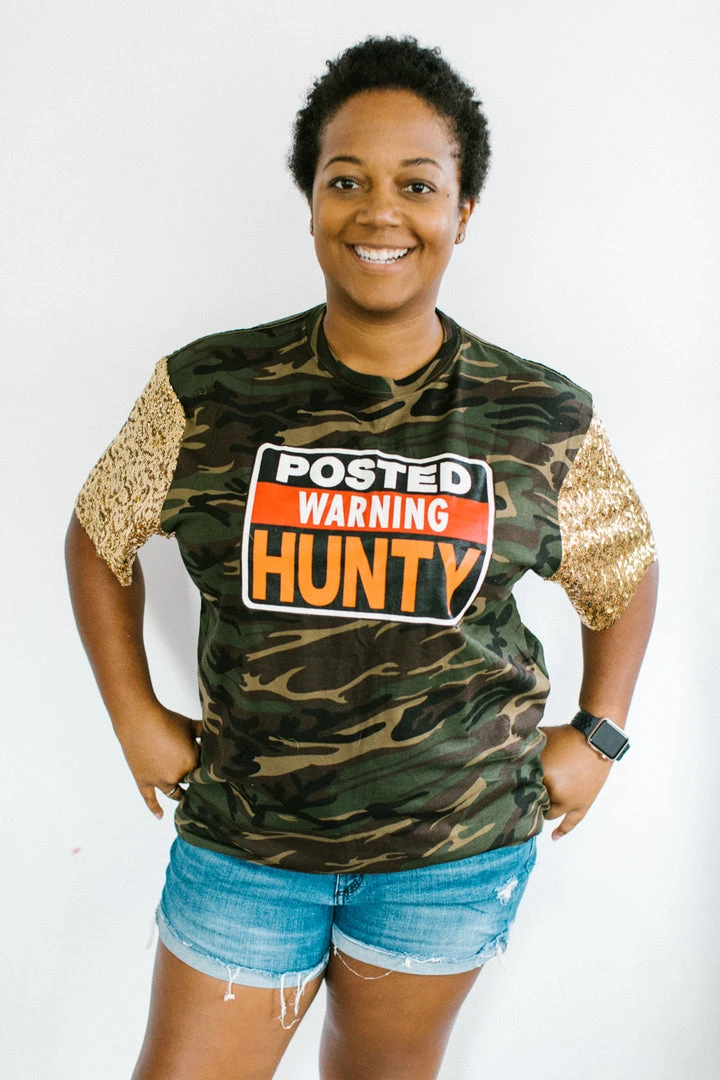 Our party tee – Hunty Cunty gold sequin sleeve T-shirt. One of a kind, limited edition.