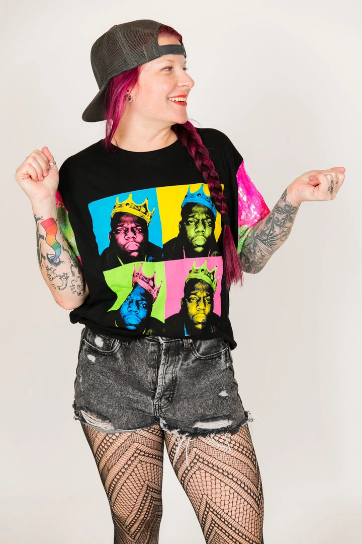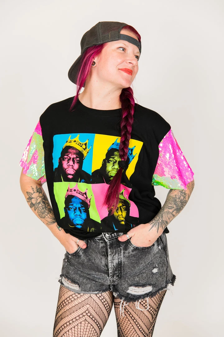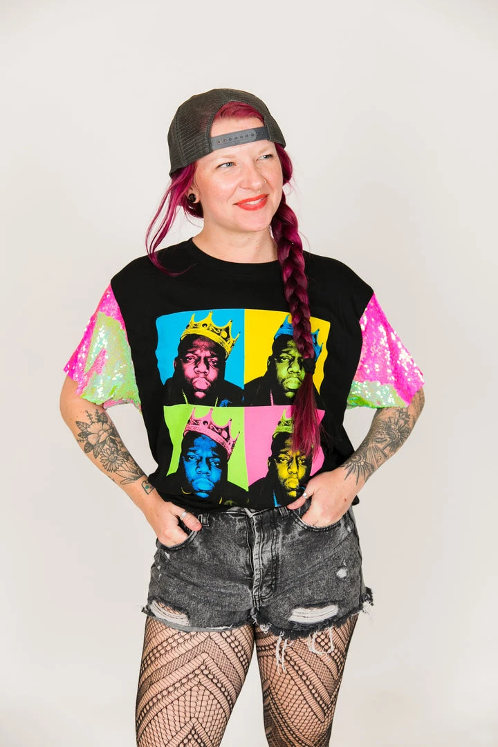 Our one of a kind party tee  – Biggie neon pink and green sequin party tee. T-shirt is made of cotton.Â