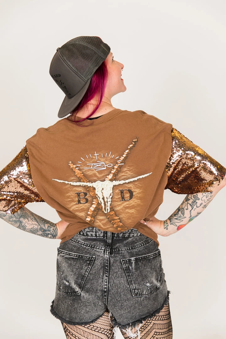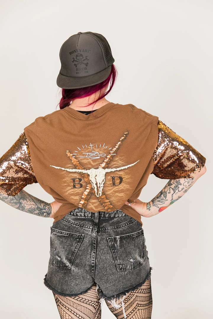 Our one of a kind party tee  – Brooks & Dunn gold and bronze sequin party tee. T-shirt is made of cotton.Â