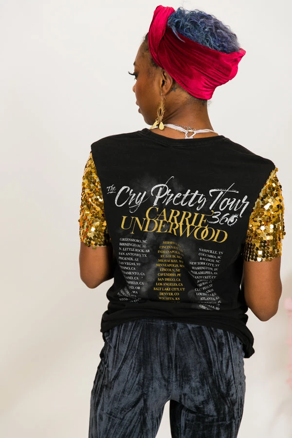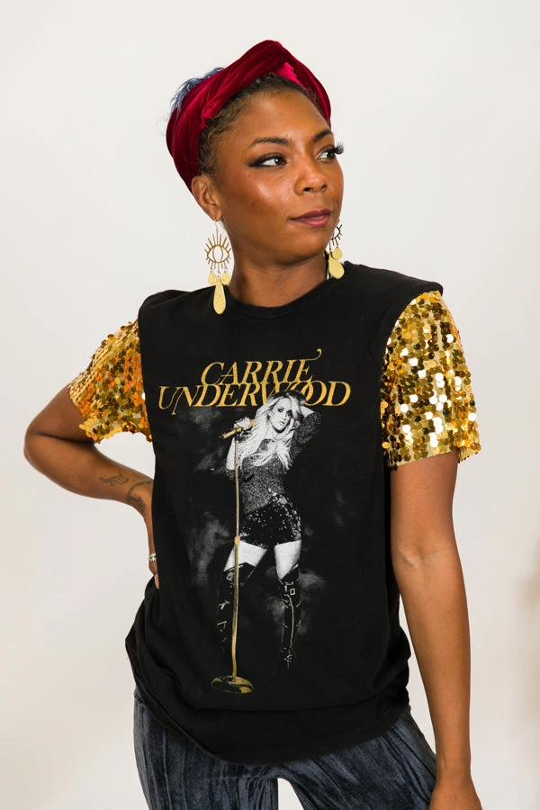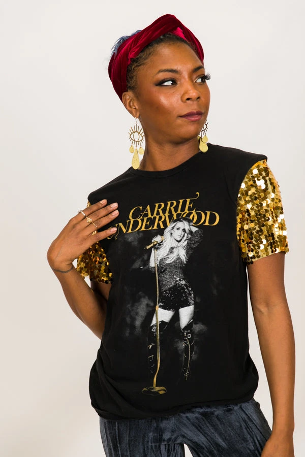 Our one of a kind party tee  – Carrie Underwood gold sequin party tee. T-shirt is made of cotton.Â