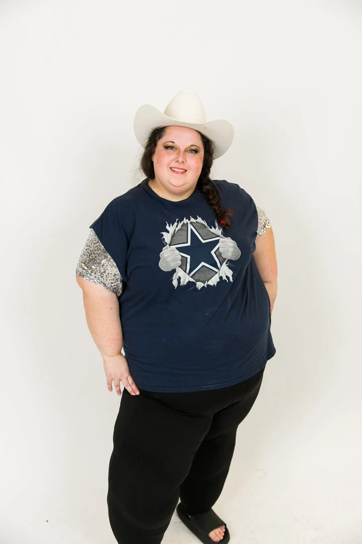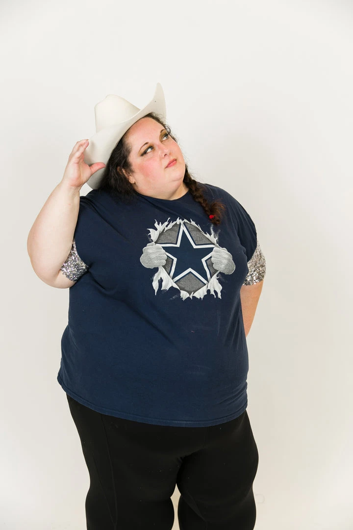 Our party tee  – Cowboys silver sequin party tee. T-shirt is made of cotton.Â