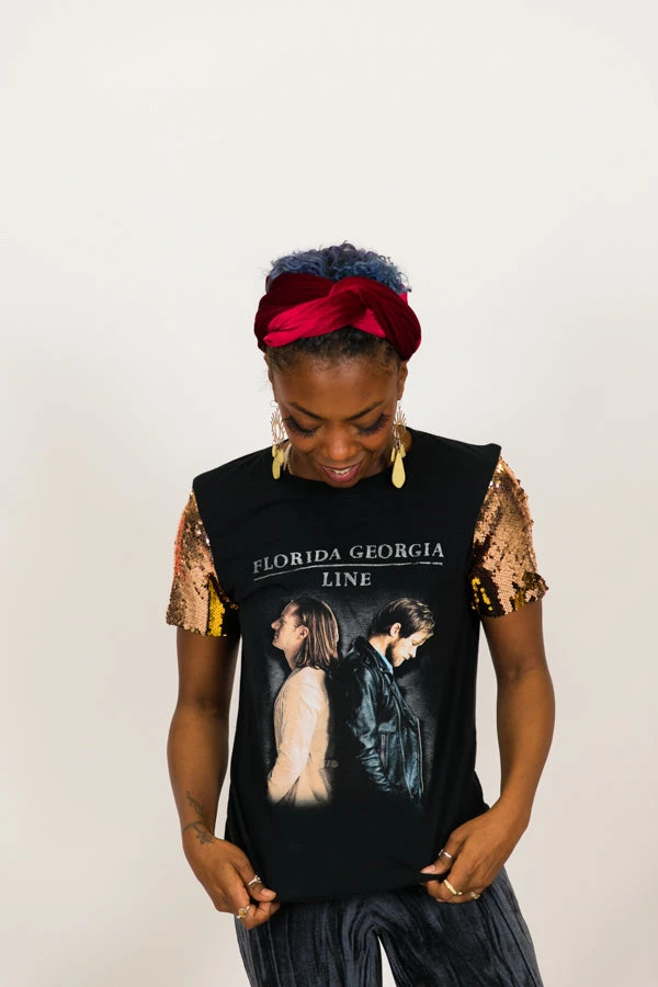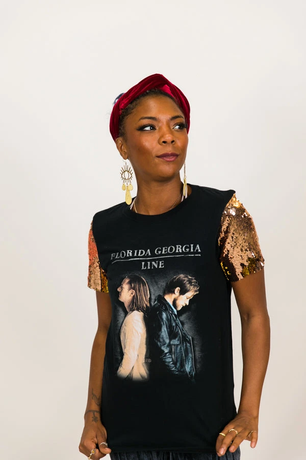 Our one of a kind party tee  – Florida Georgia Line bronzesequin party tee. T-shirt is made of cotton.Â