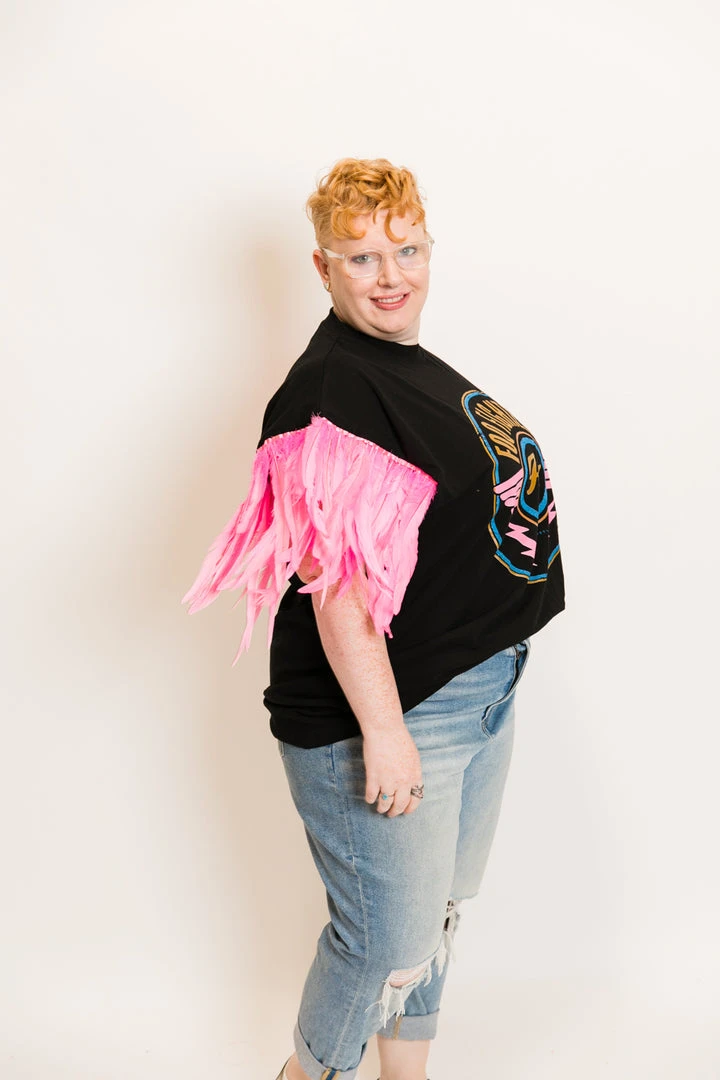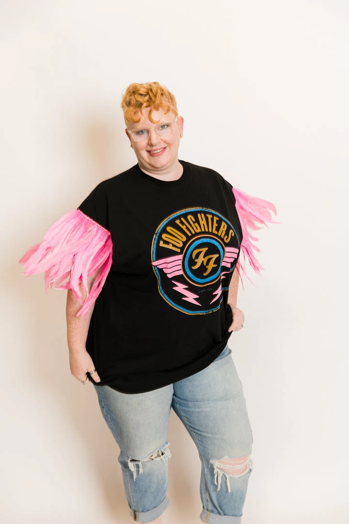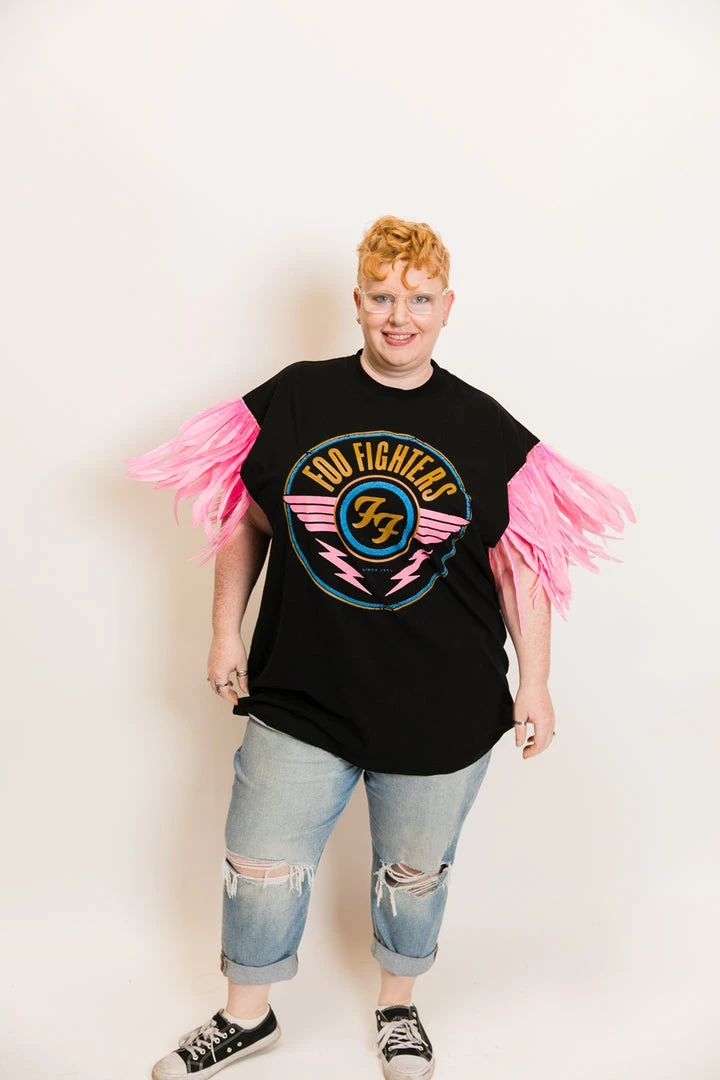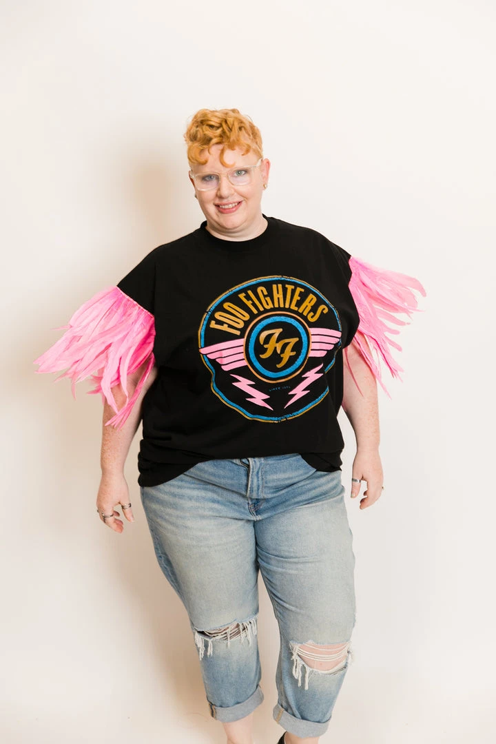 Our one of a kind party tee  – Foo fighters pink feather sleeve party tee. T-shirt is made of cotton.Â