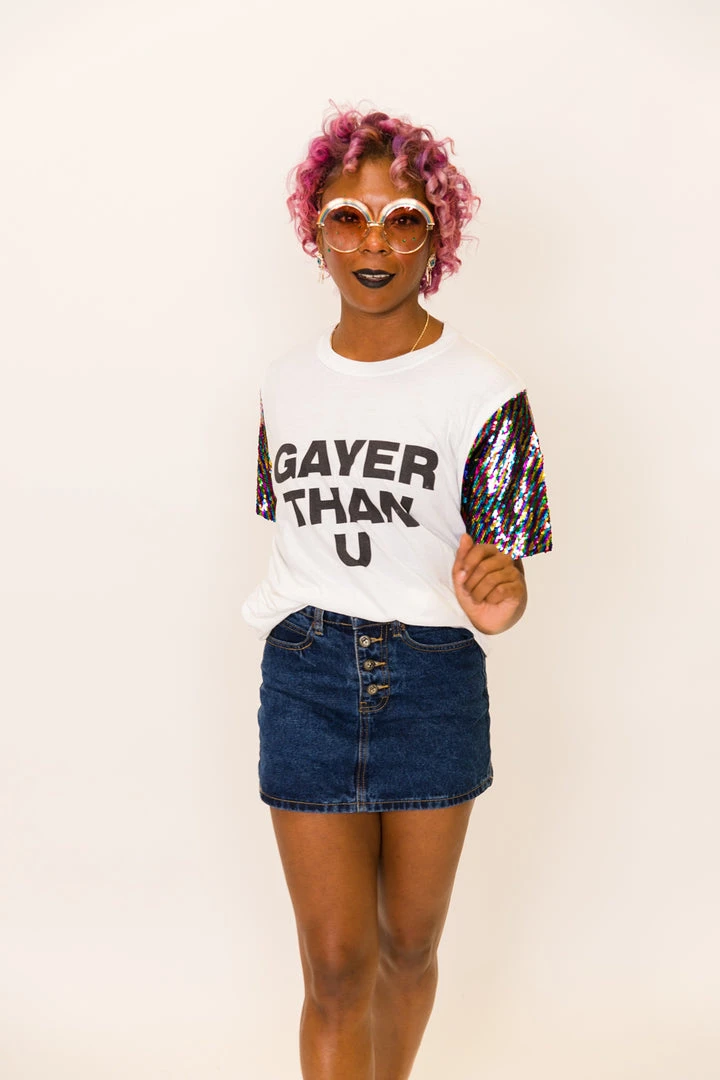 Our one of a kind party tee -Gayer Than U rainbow sequin party tee. T-shirt is made of cotton.