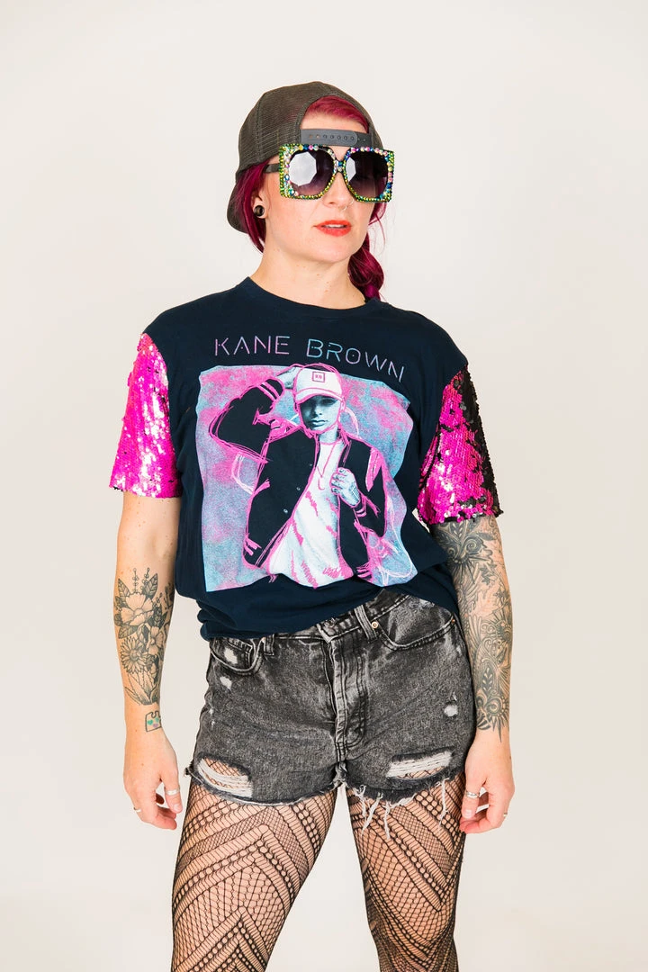 Our one of a kind party tee  – Kane Brown pink and black sequin party tee. T-shirt is made of cotton.Â