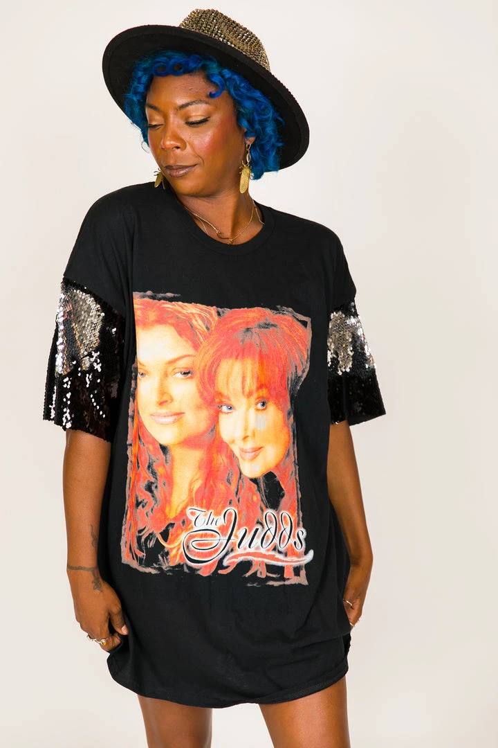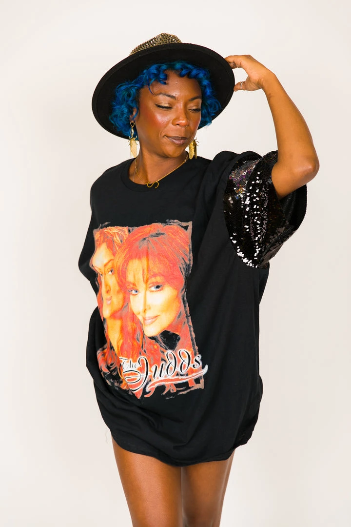 Our one of a kind party tee  – The Judds black and gold sequin party tee. T-shirt is made of cotton.Â