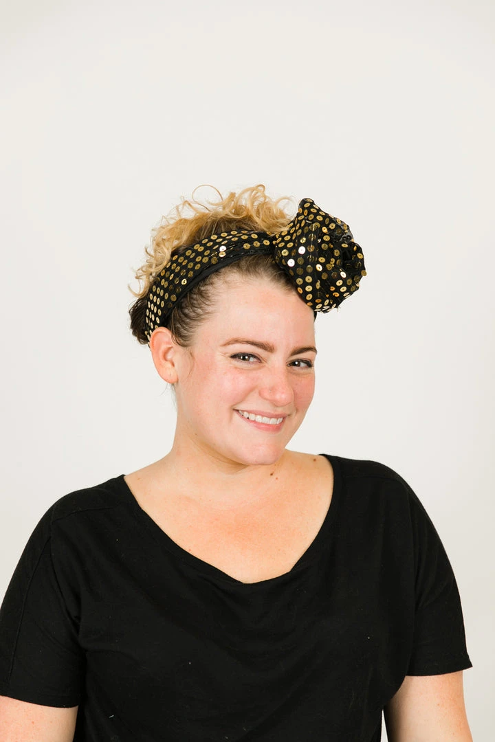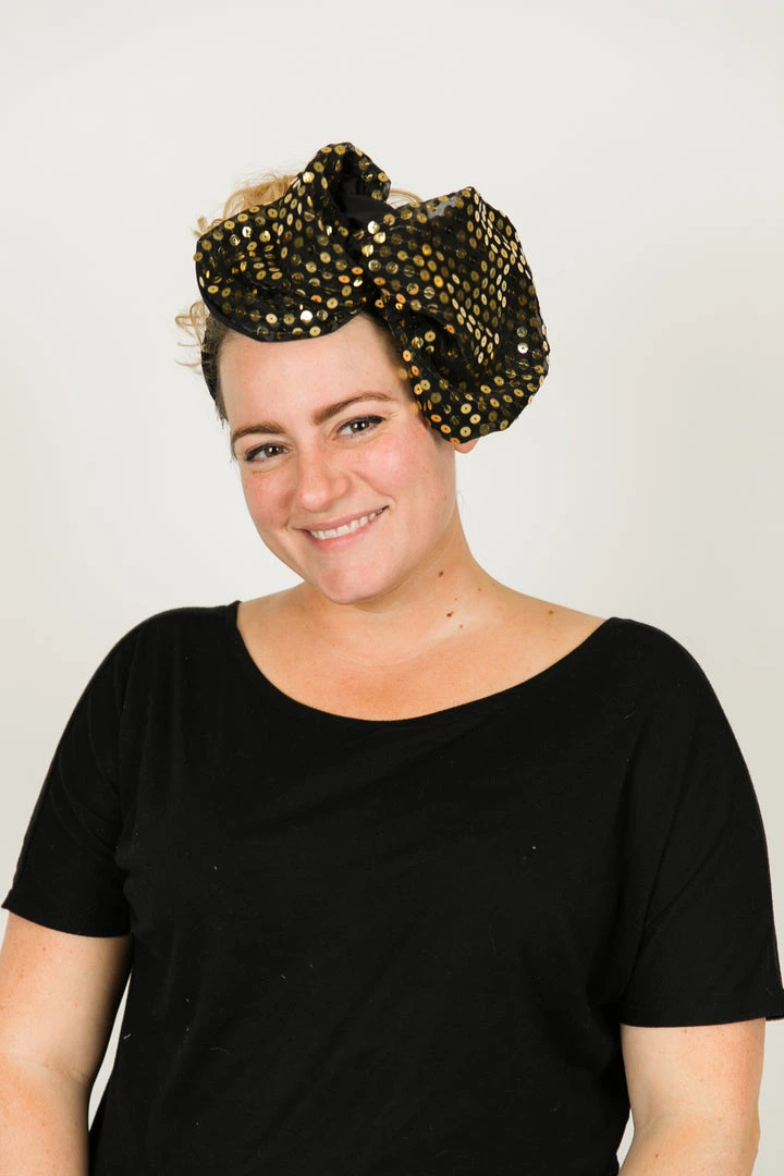 Our party headwrap  – made in gold sequin with black cotton backing. Adjustable wire for versatility of use and design.