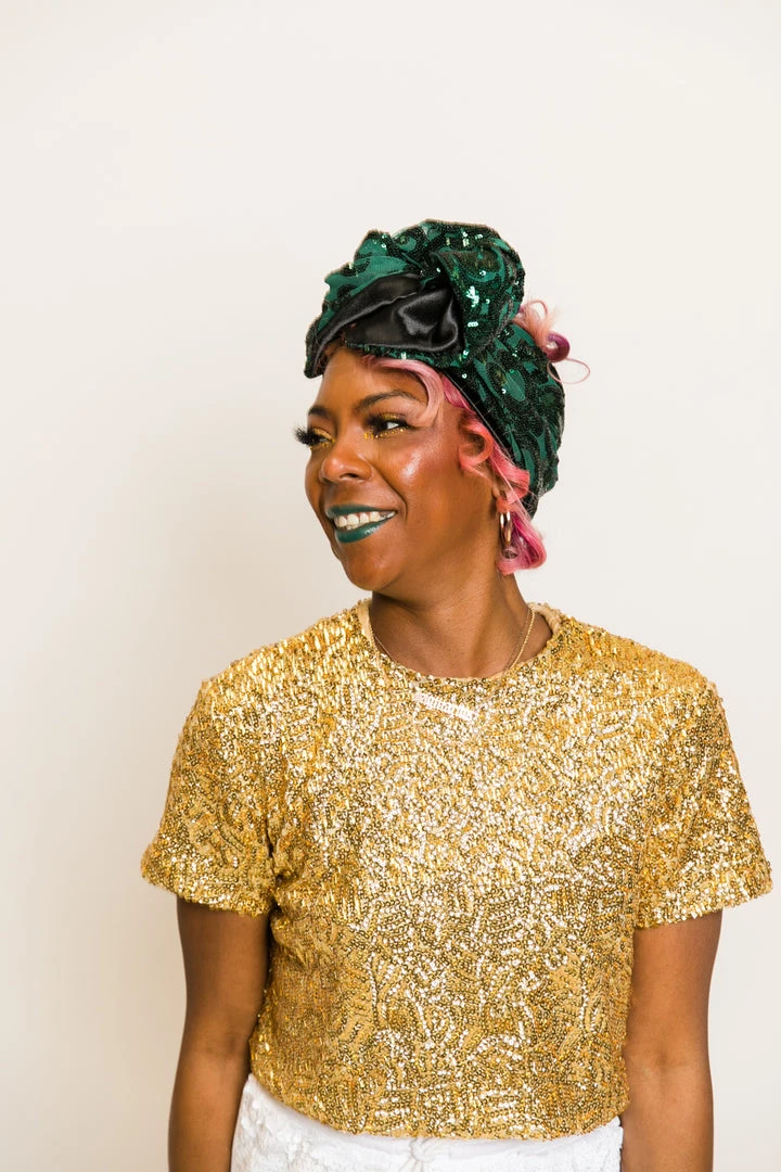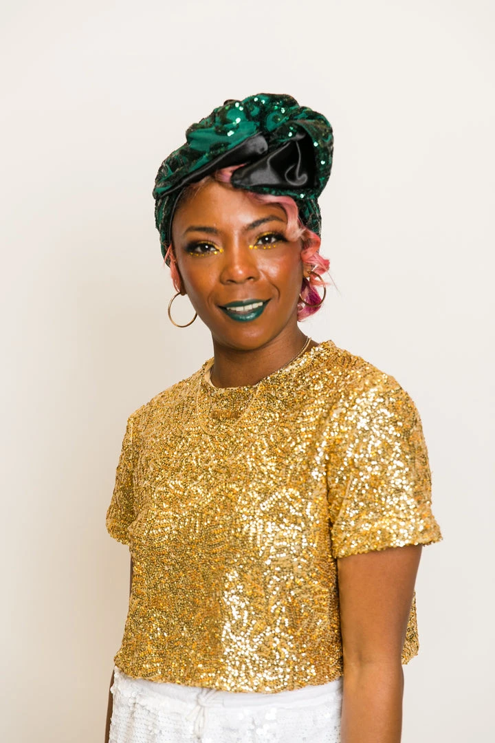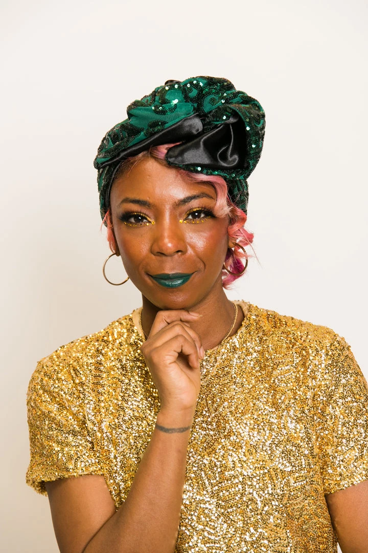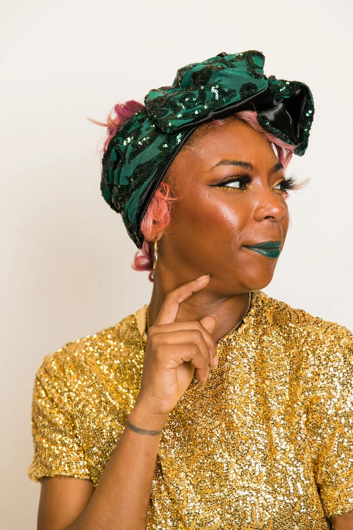 Our classic wrap – made in green sequin embroidered fabric.