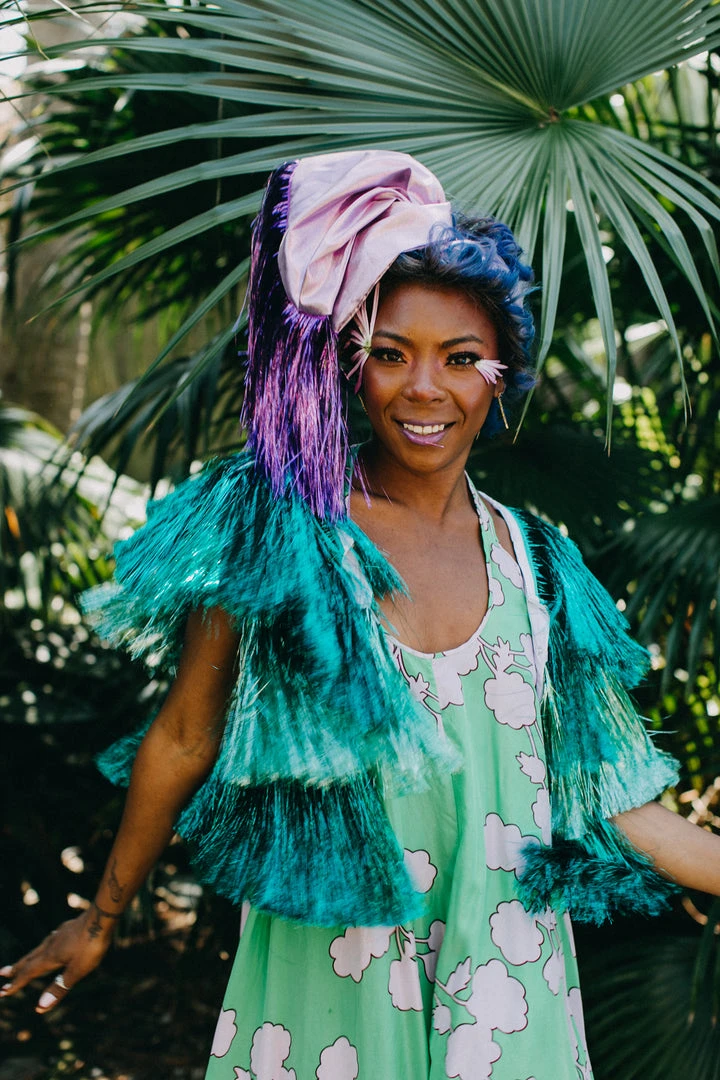 Our classic wrap – made in purple metallic with purple tinsel fringe