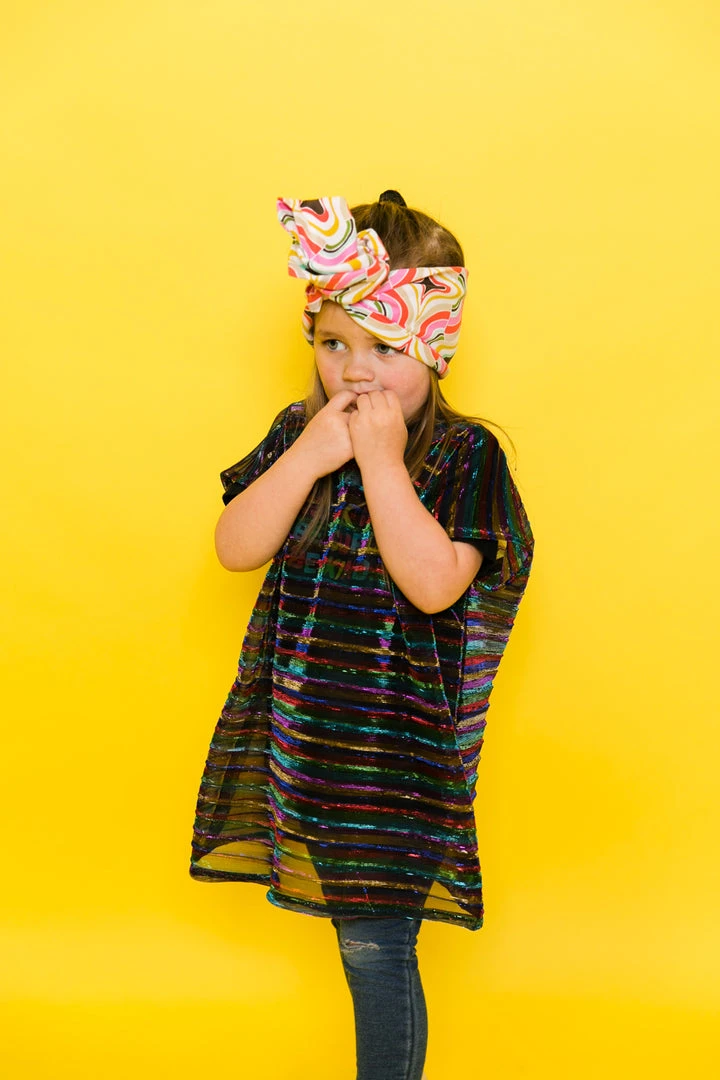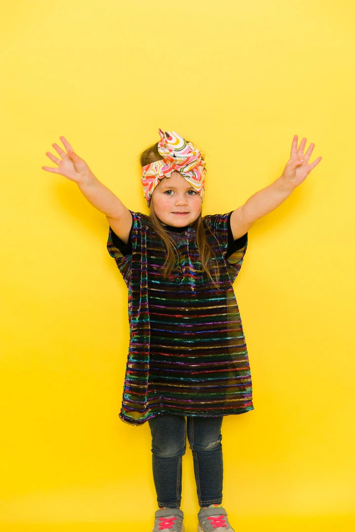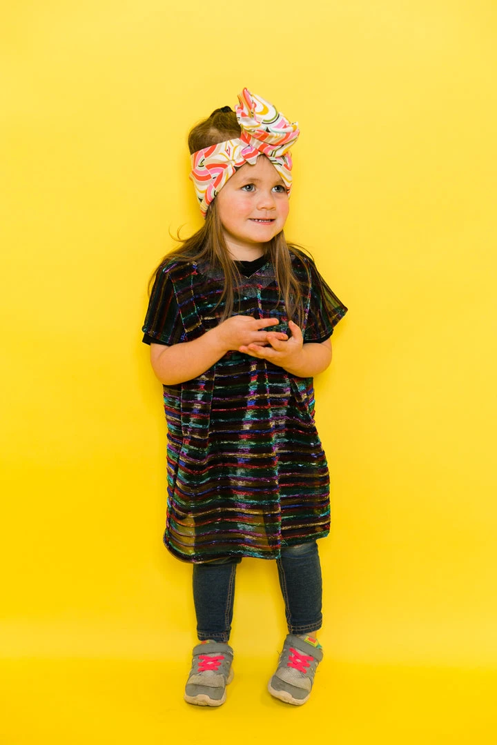 Our mini wrap  – made in rainbow stripe stretch. Adjustable wire for versatility of use and design. Please note adults can wear these, they will be smaller than our regular wraps but still fit adults.