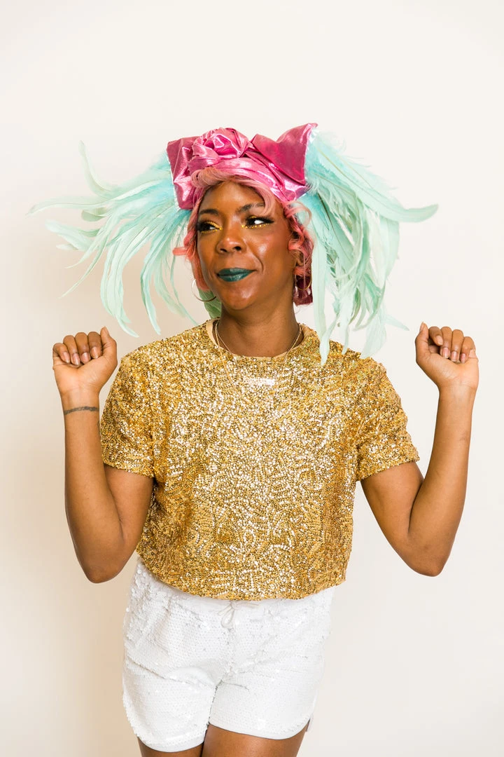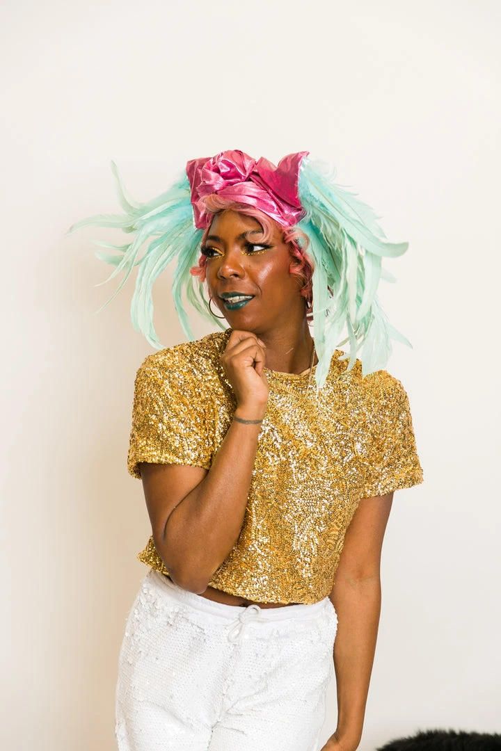 Our classic wrap  – made in pink metallic with green feather trim.Â