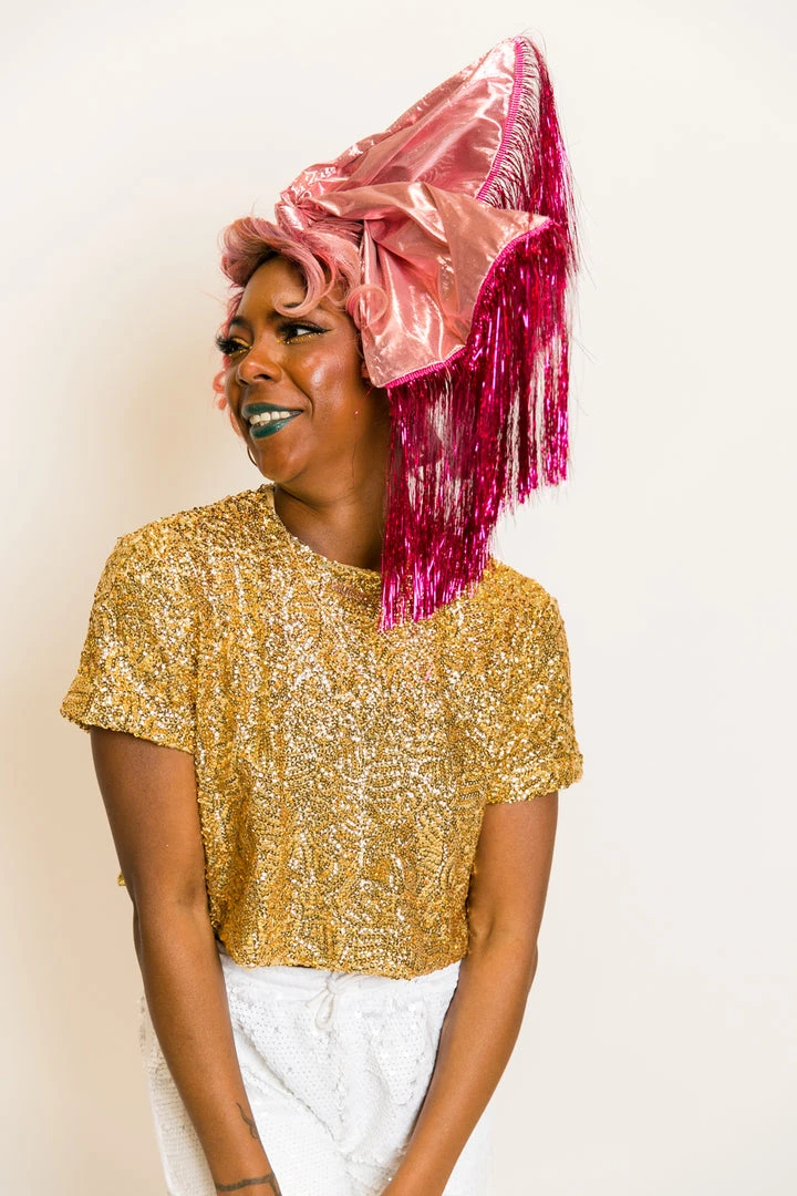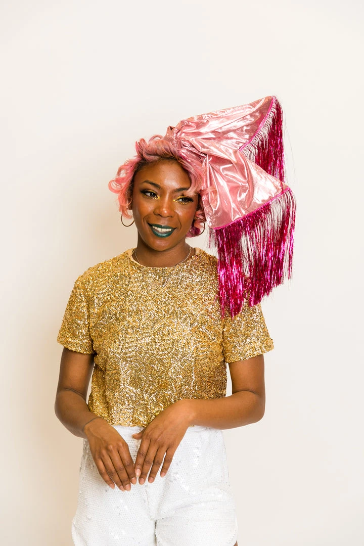Our classic wrap  – made in pink metallic with pink tinsel fringe.Â
