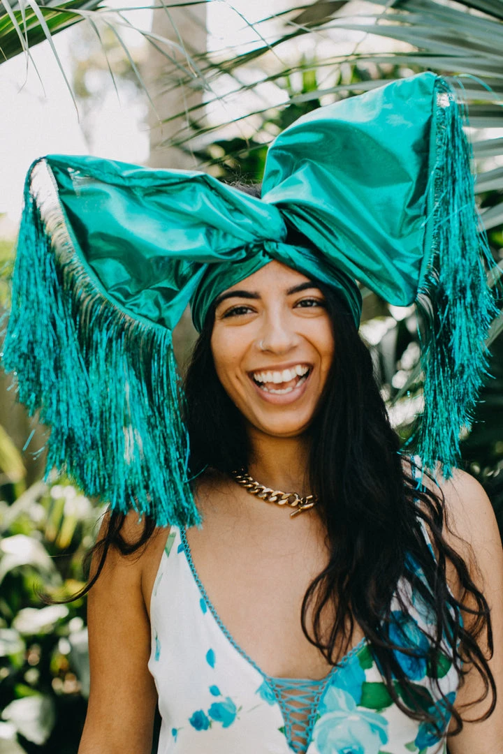 Our classic wrap  – made in teal metallic with teal tinsel trim