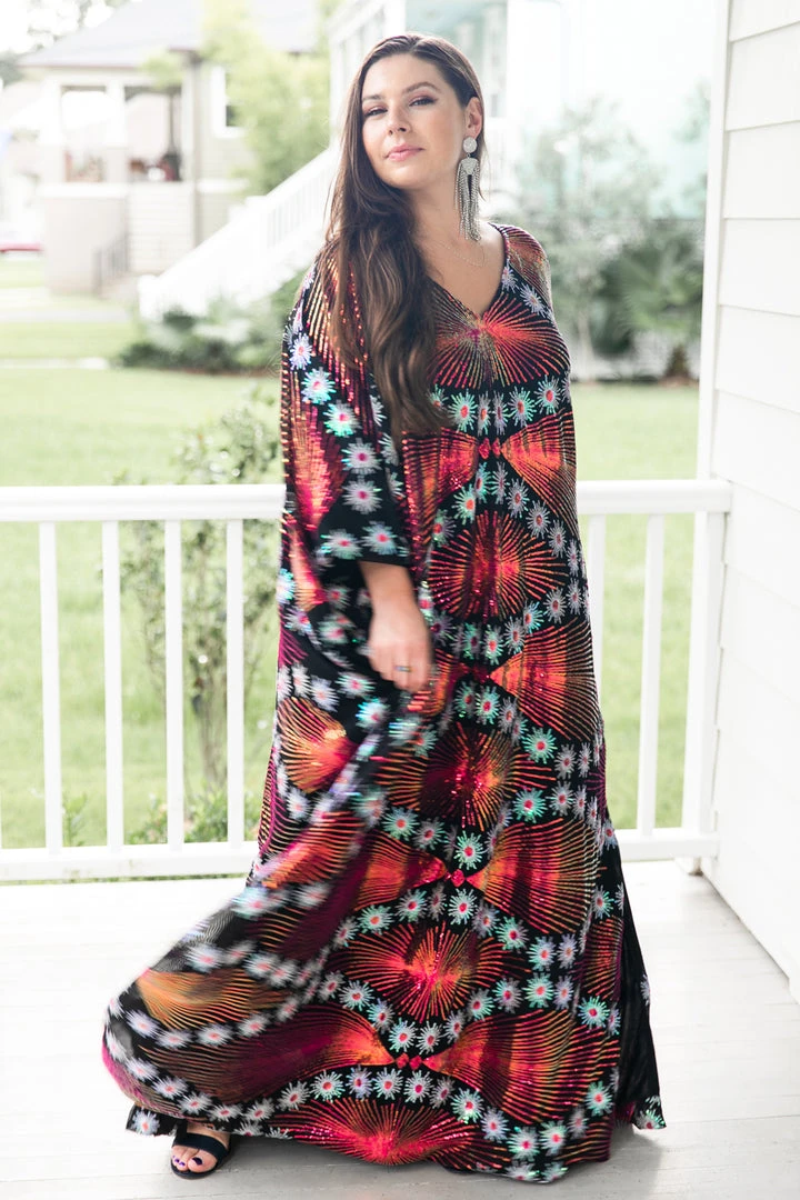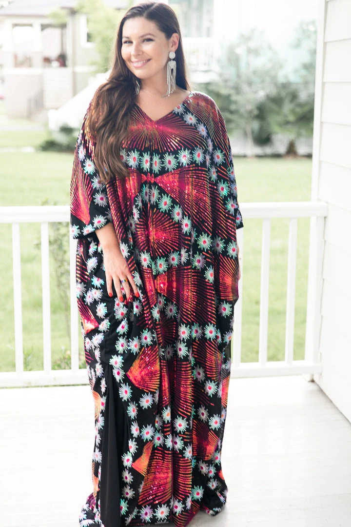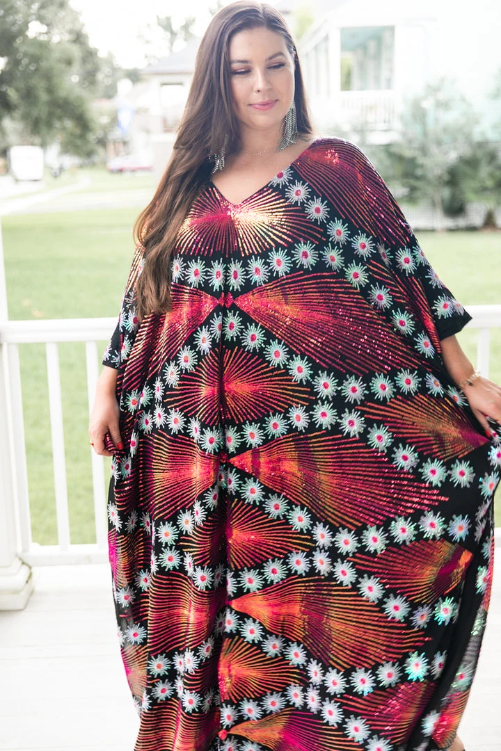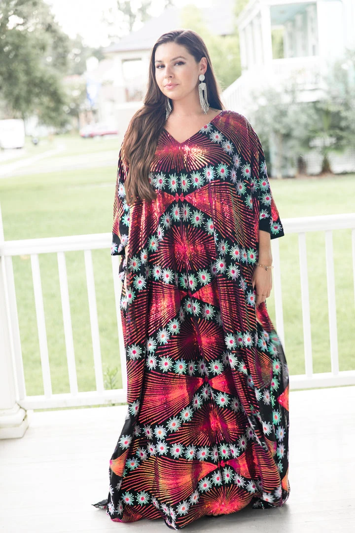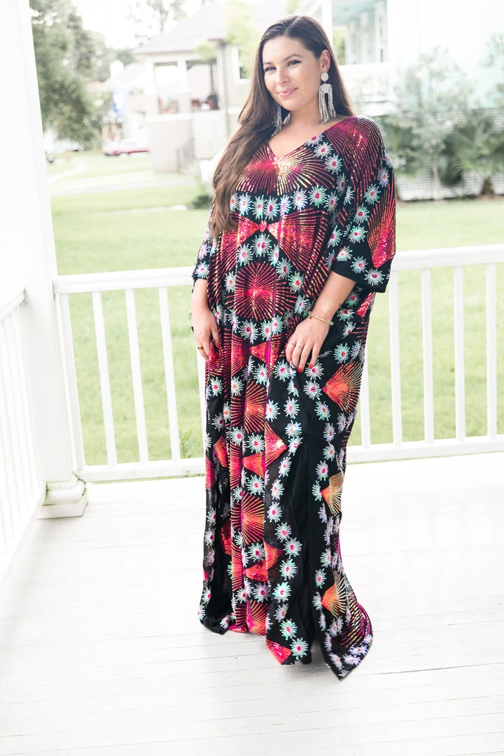 Pink holographic floral embroidered long caftan. Lined with poly black stretch fabric
