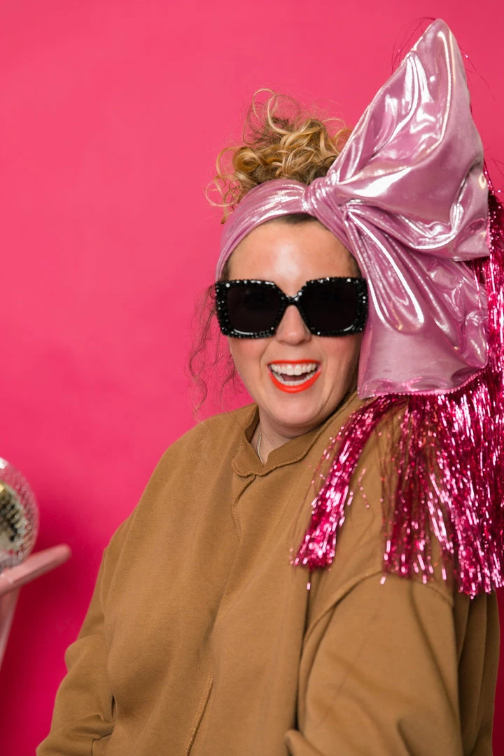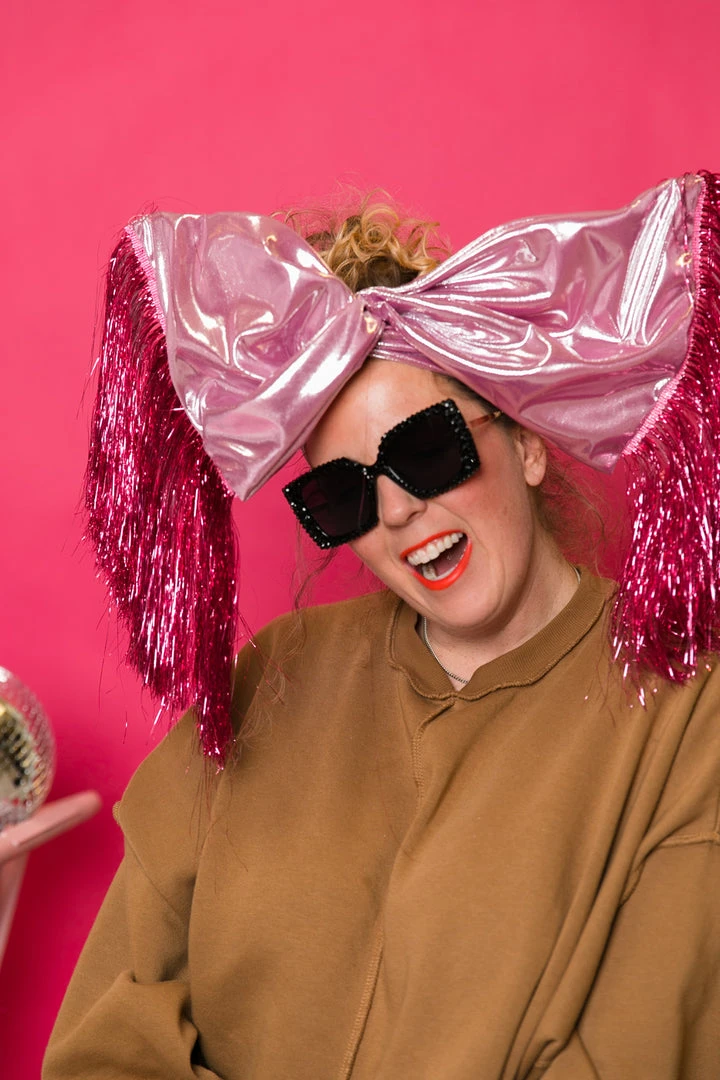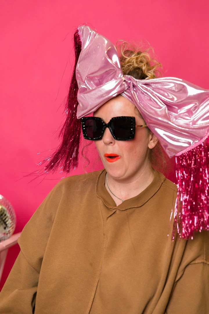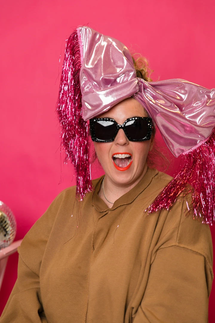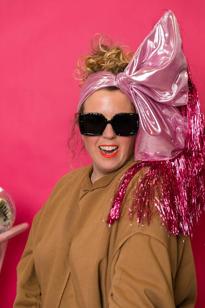 Our classic wrap  – made in pink metallic with pink tinsel trim