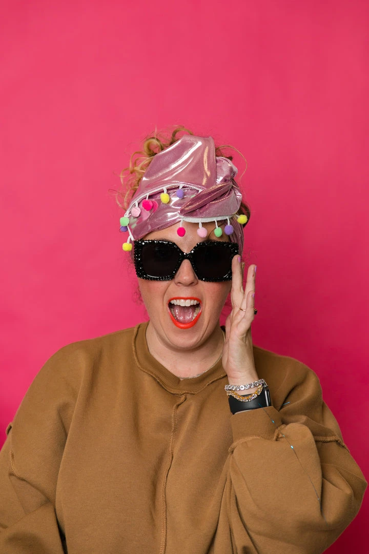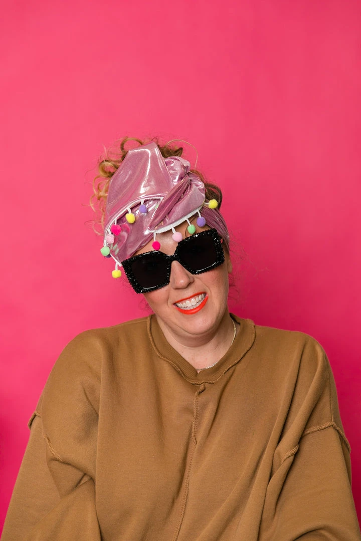 Our classic wrap  – made in pink metallic with pom poms