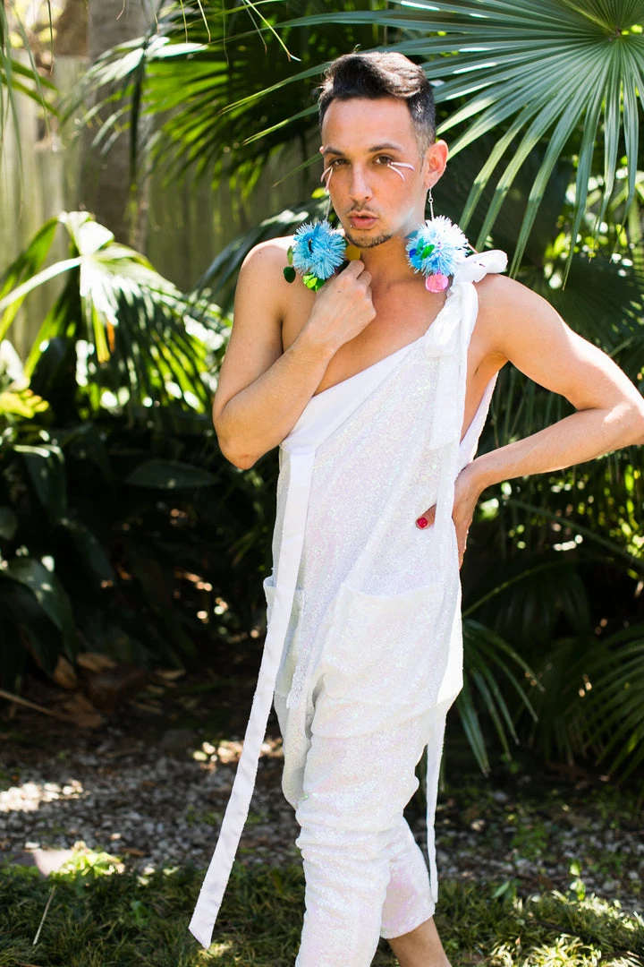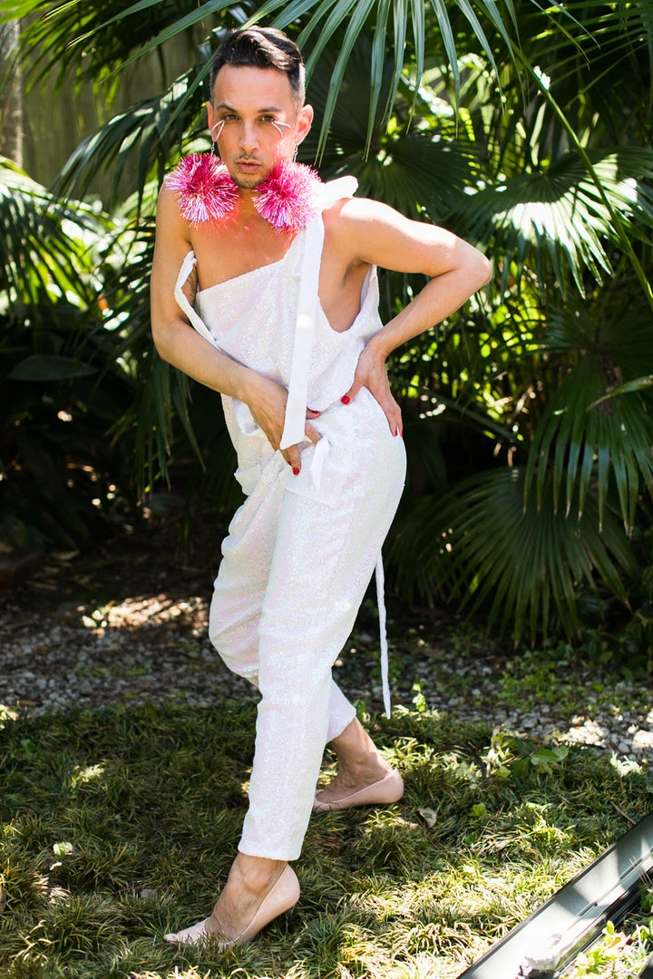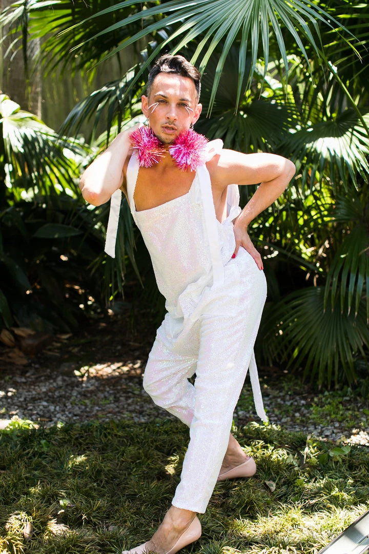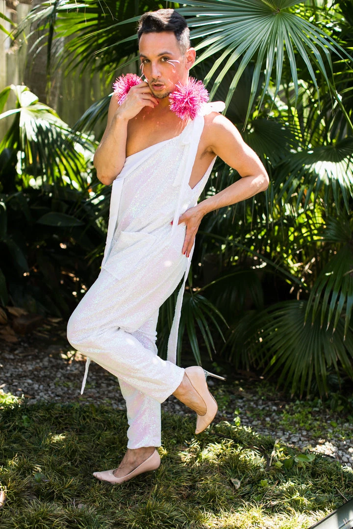 Our party jumpsuit -pink white iridescent adjustable tie sequin jumpsuit with pockets.