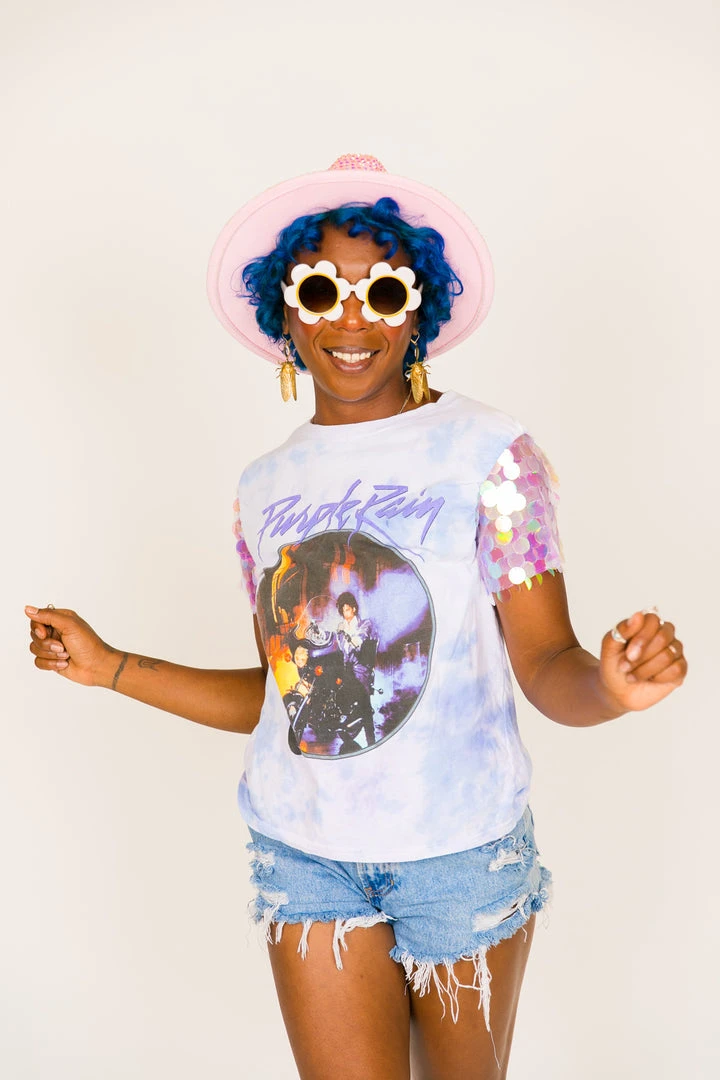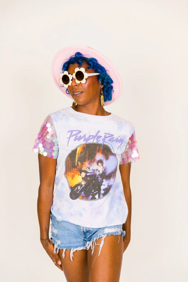 Our one of a kind party tee  – Prince purple paillette sequin sleeve party tee. T-shirt is made of cotton.Â