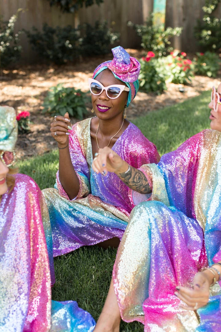 Our classic headwrap – made in rainbow ombre sequin with light blue metallic backing.Â