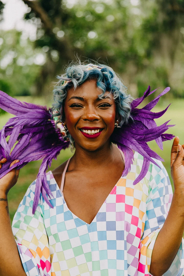 Our classic wrap  – made in rainbow metallic polka dot with purple feather trim