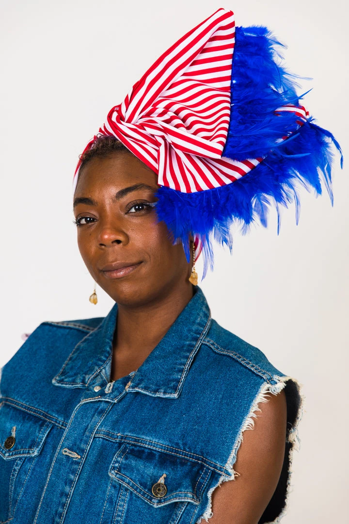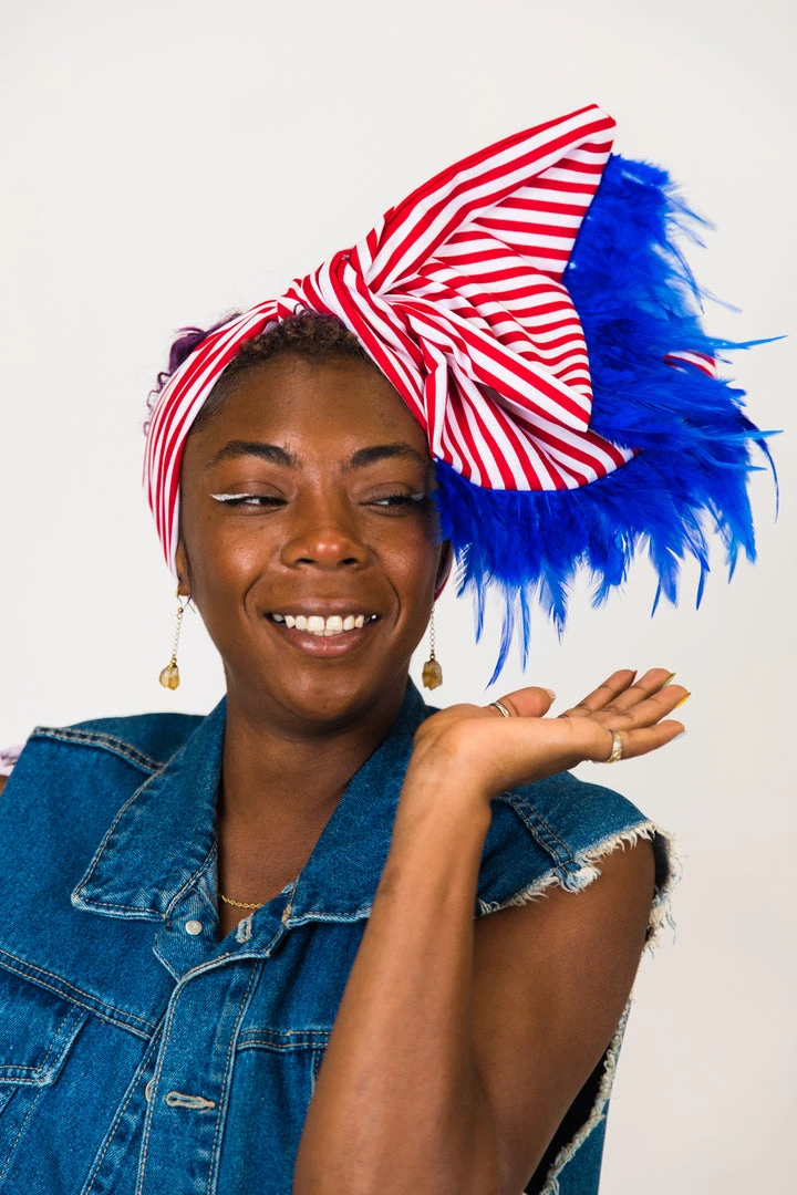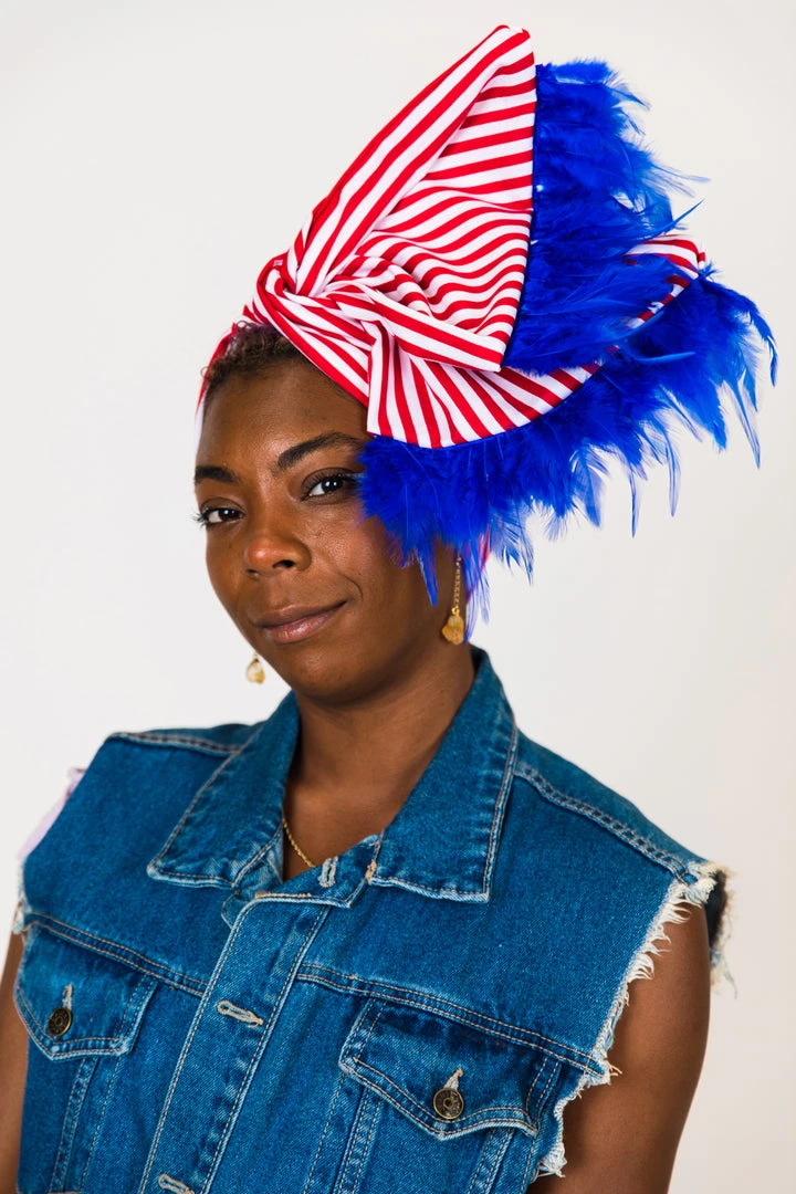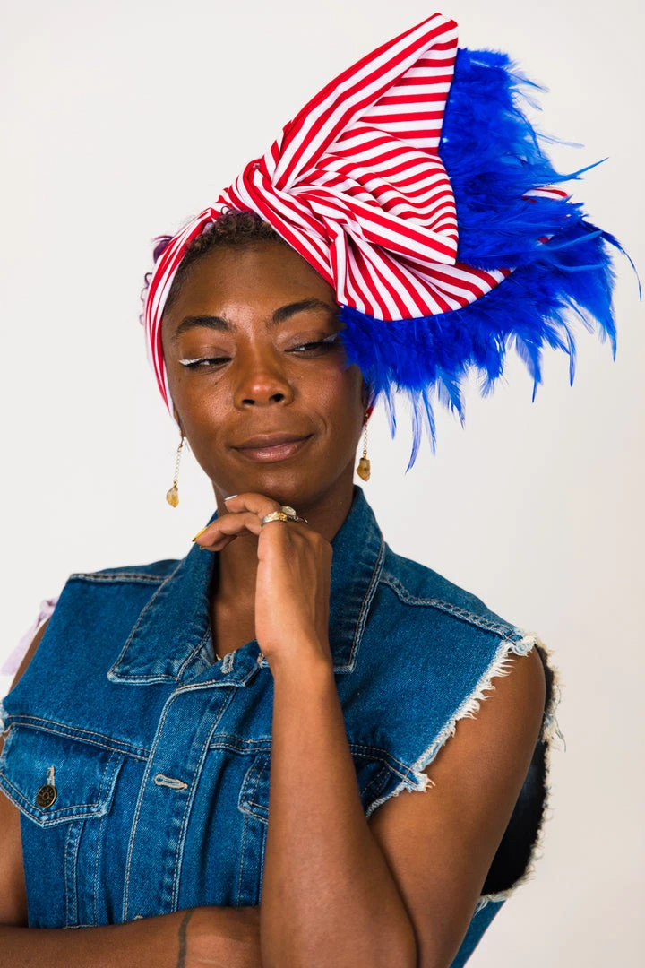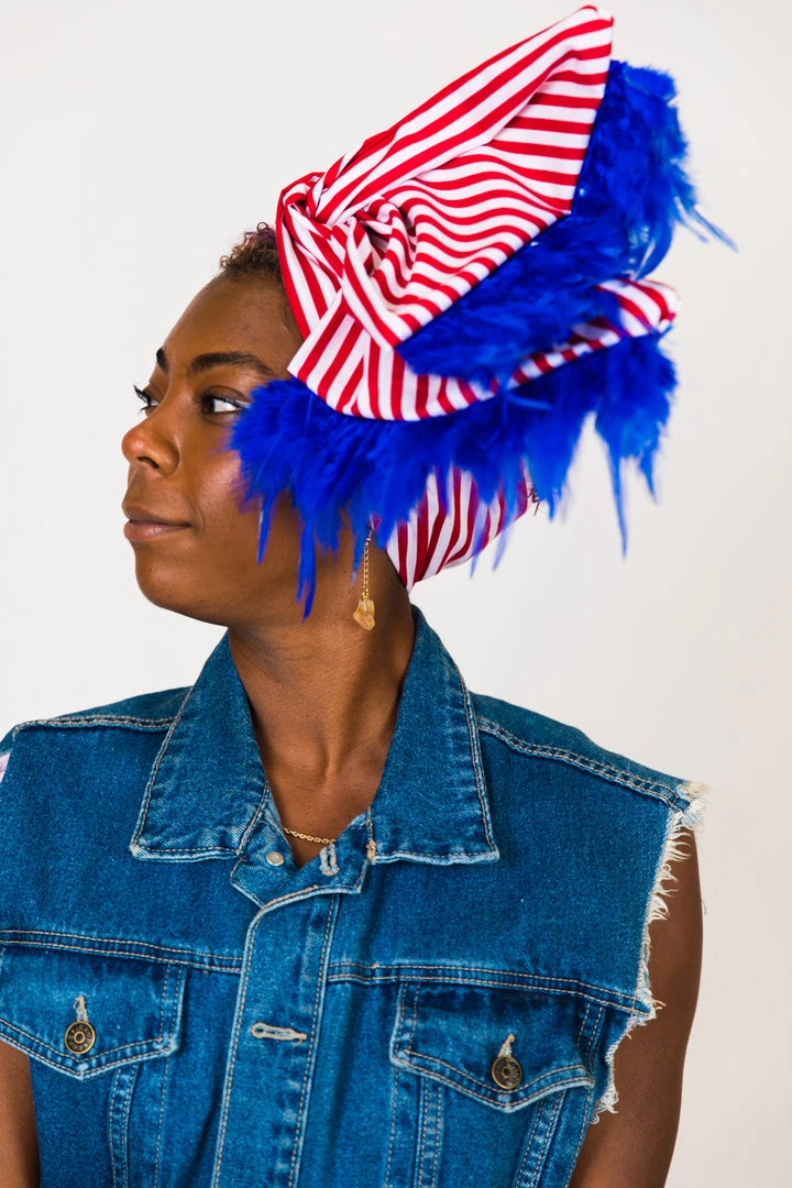 Our classic wrap – made in red and white stripe cotton fabric with blue feather trim.