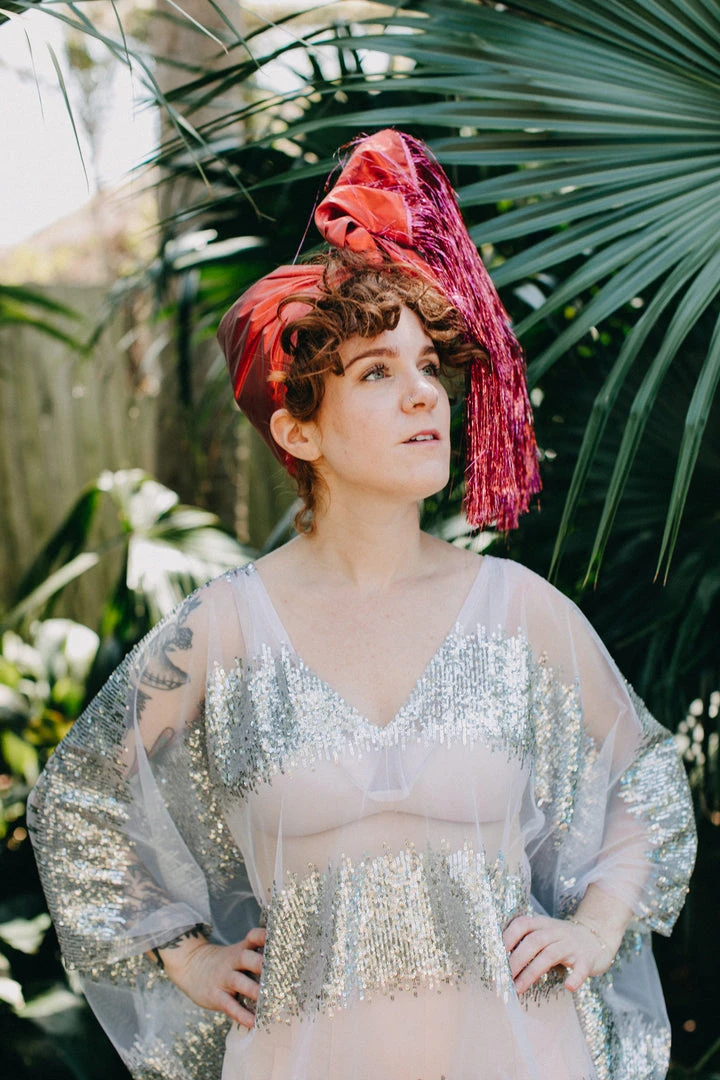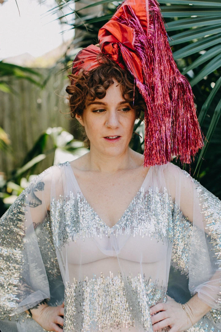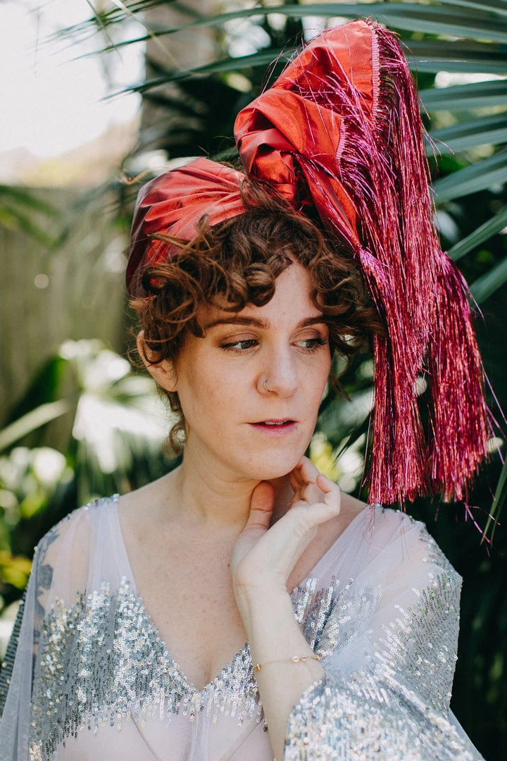 Our classic wrap  – made in red metallic with pink tinsel trim